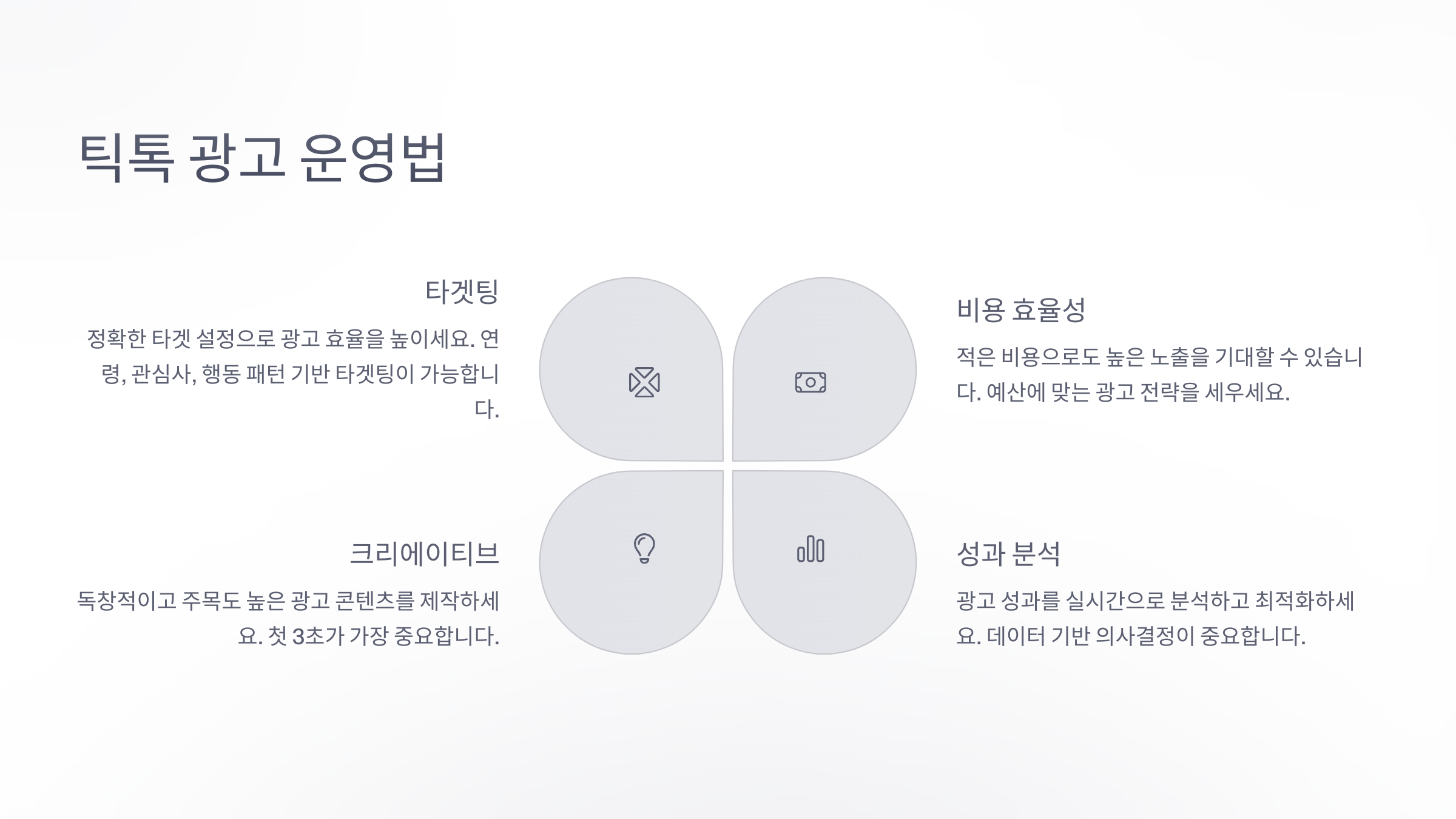 틱톡 광고는 ‘영상 기반 광고’로, 콘텐츠와 광고의 경계가 없다는 점이 가장 큰 특징이에요. 자연스럽게 스며들수록 효과가 좋아요.📢 광고 세팅 팁 - 광고 매니저: TikTok for Business - 광고 목표: 조회수, 클릭, 전환 선택 가능 - 크리에이티브: 자연스러운 영상으로 구성 - 타겟 설정: 관심사, 연령, 지역까지 세밀하게 가능