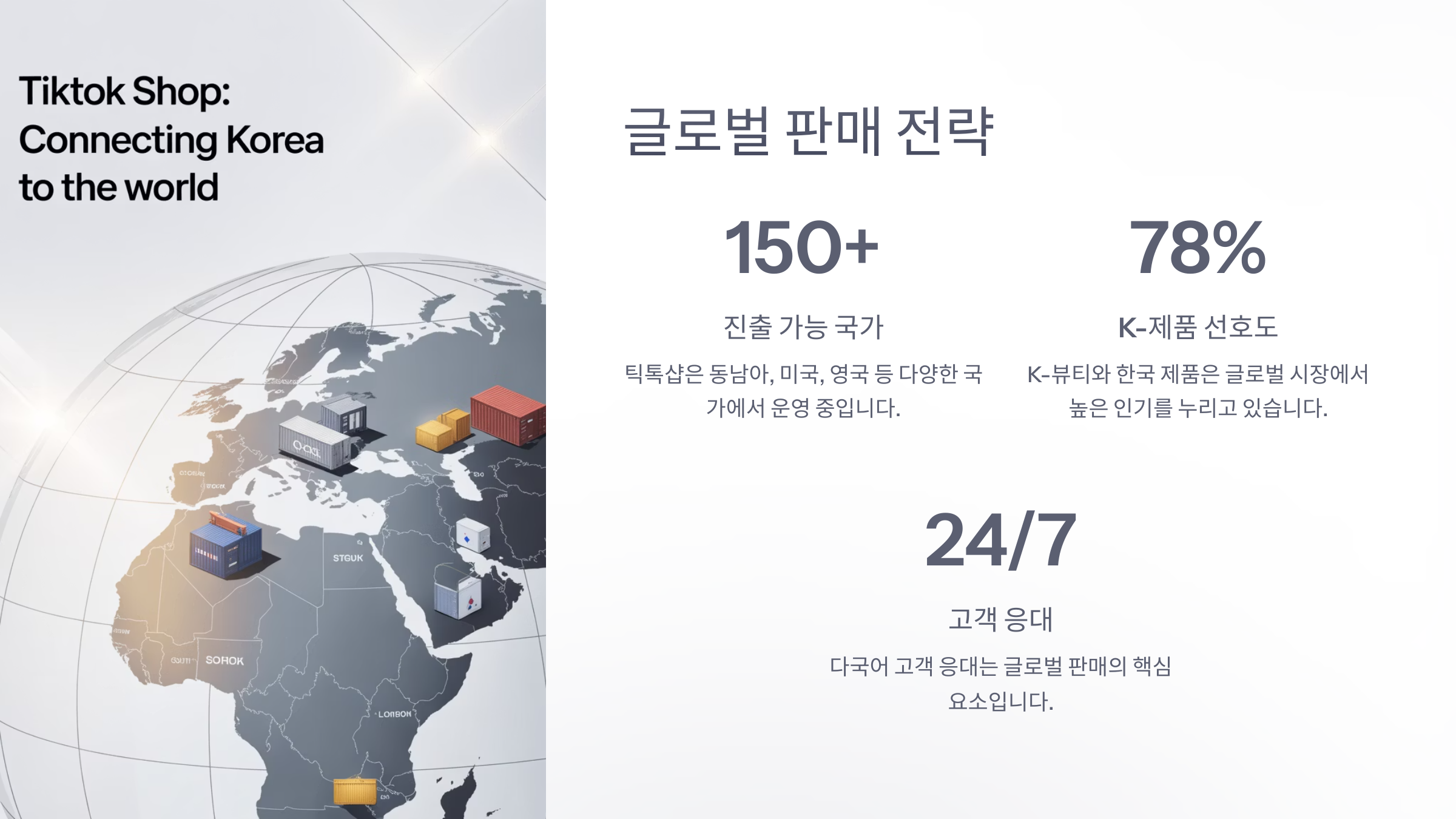 글로벌 판매 전략 틱톡은 글로벌 플랫폼이에요. 특히 동남아, 미국, 영국 시장에서 쇼핑기능이 활발하게 운영되고 있어서, 초보 셀러도 해외 진출이 가능해요!