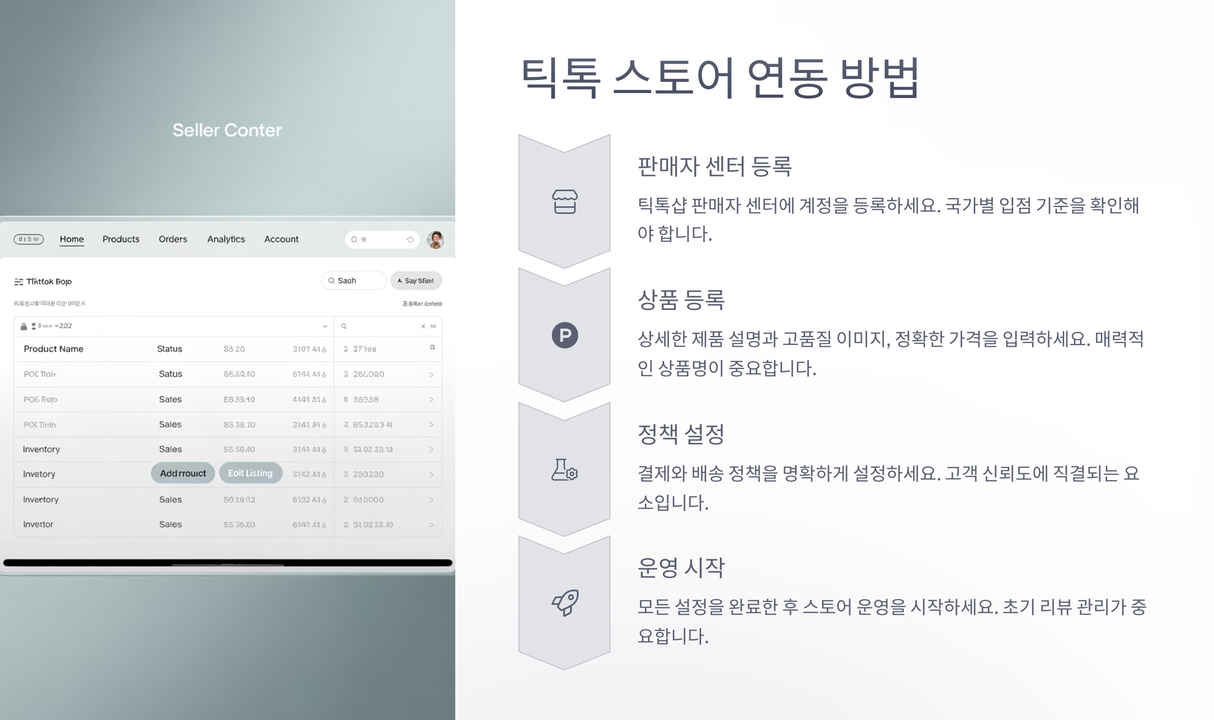 틱톡 내에서 직접 제품을 판매하려면 ‘틱톡 스토어’를 개설해야 해요. 링크연결보다 더 직관적이고 전환율이 높아지는 구조예요.🛒 개설 절차 1⃣ [TikTok Seller Center](https://seller.tiktokglobalshop.com/) 접속 2⃣ 이메일 가입 → 국가 선택 3⃣ 사업자 등록증 or 개인 신분증 업로드 4⃣ 통장 및 카드 등록 5⃣ 상품 등록 + 쇼핑탭 연동