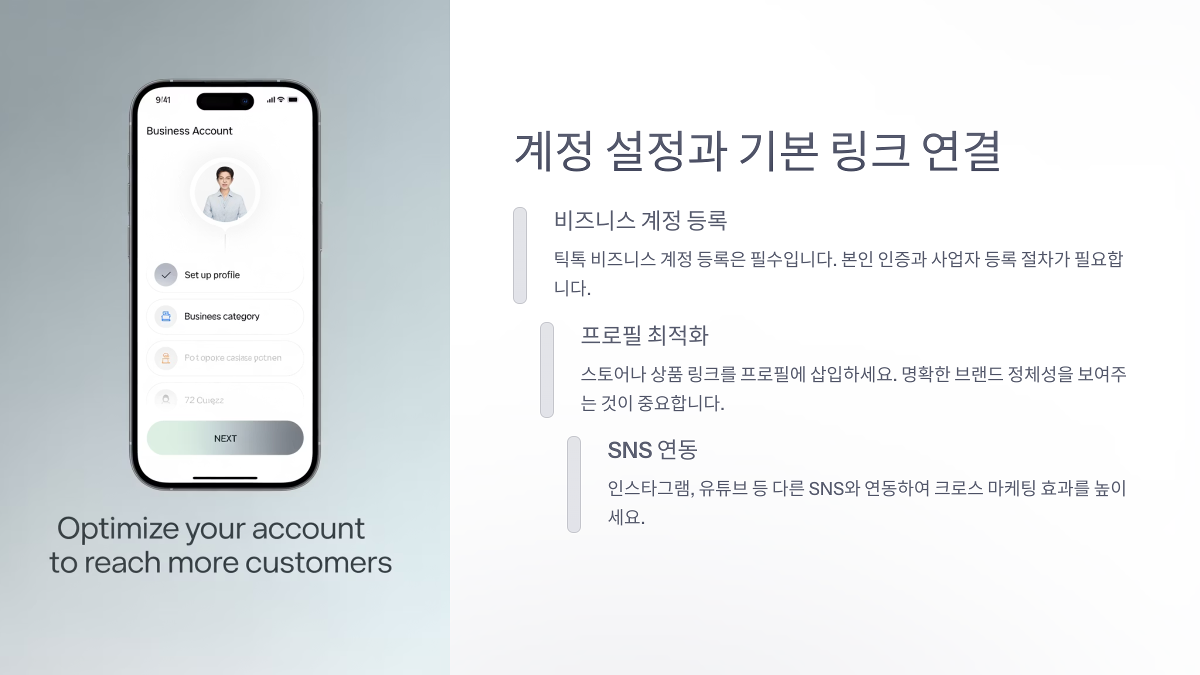 📱 계정 설정 순서 1⃣ 틱톡 계정 생성 2⃣ 프로필 설정: 사진, 설명, 링크 추가 3⃣ '비즈니스 계정'으로 전환 4⃣ 링크트리 또는 스마트스토어 URL 연결 5⃣ 쇼핑 연동 신청 (틱톡 스토어 or 외부 링크 연동)