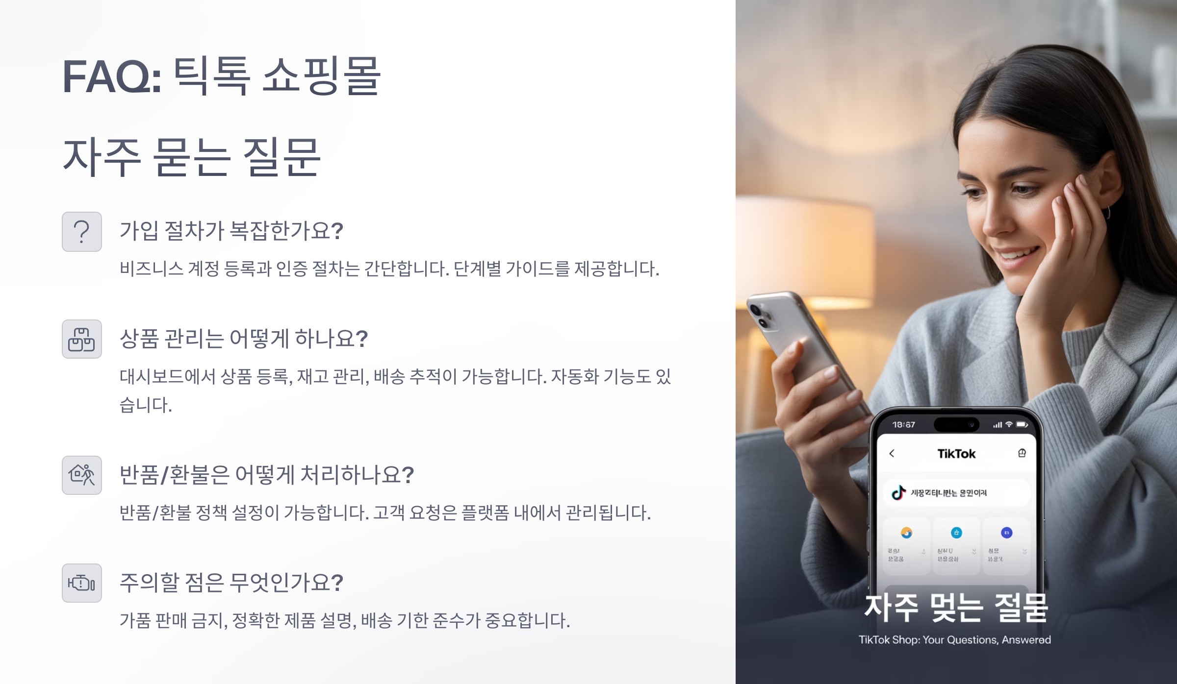 Q1. 틱톡 쇼핑은 꼭 틱톡 스토어가 있어야 하나요?A1. 아니요! 스마트스토어나 외부몰 링크로도 운영 가능하지만, 스토어 연동 시 전환율이 더 좋아요.