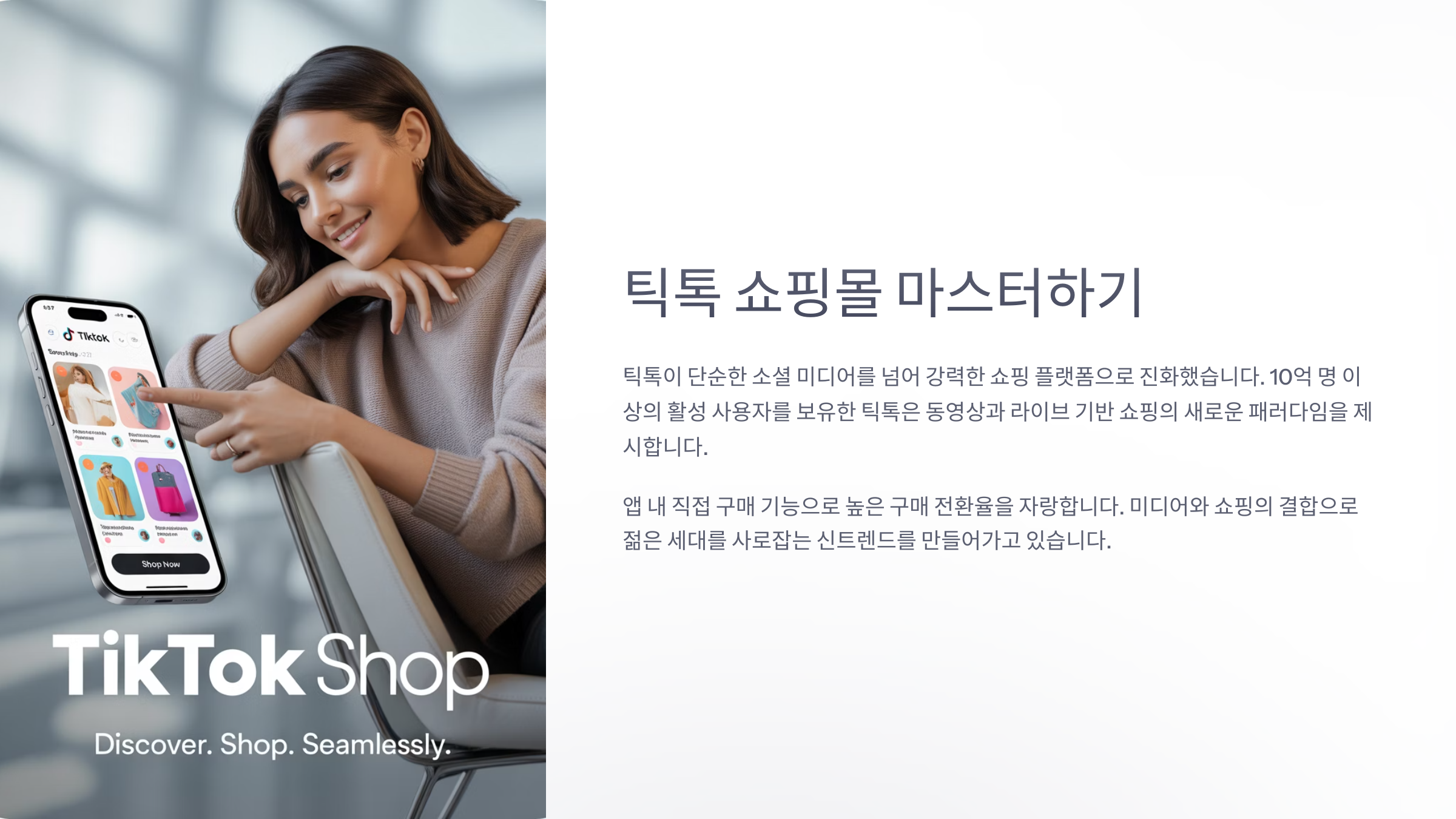 이제 틱톡 커머스의 구조부터, 영상 제작 전략, 쇼핑몰 연동, 글로벌 확장까지 완전 실전 중심으로 알려드릴게요! 🎯