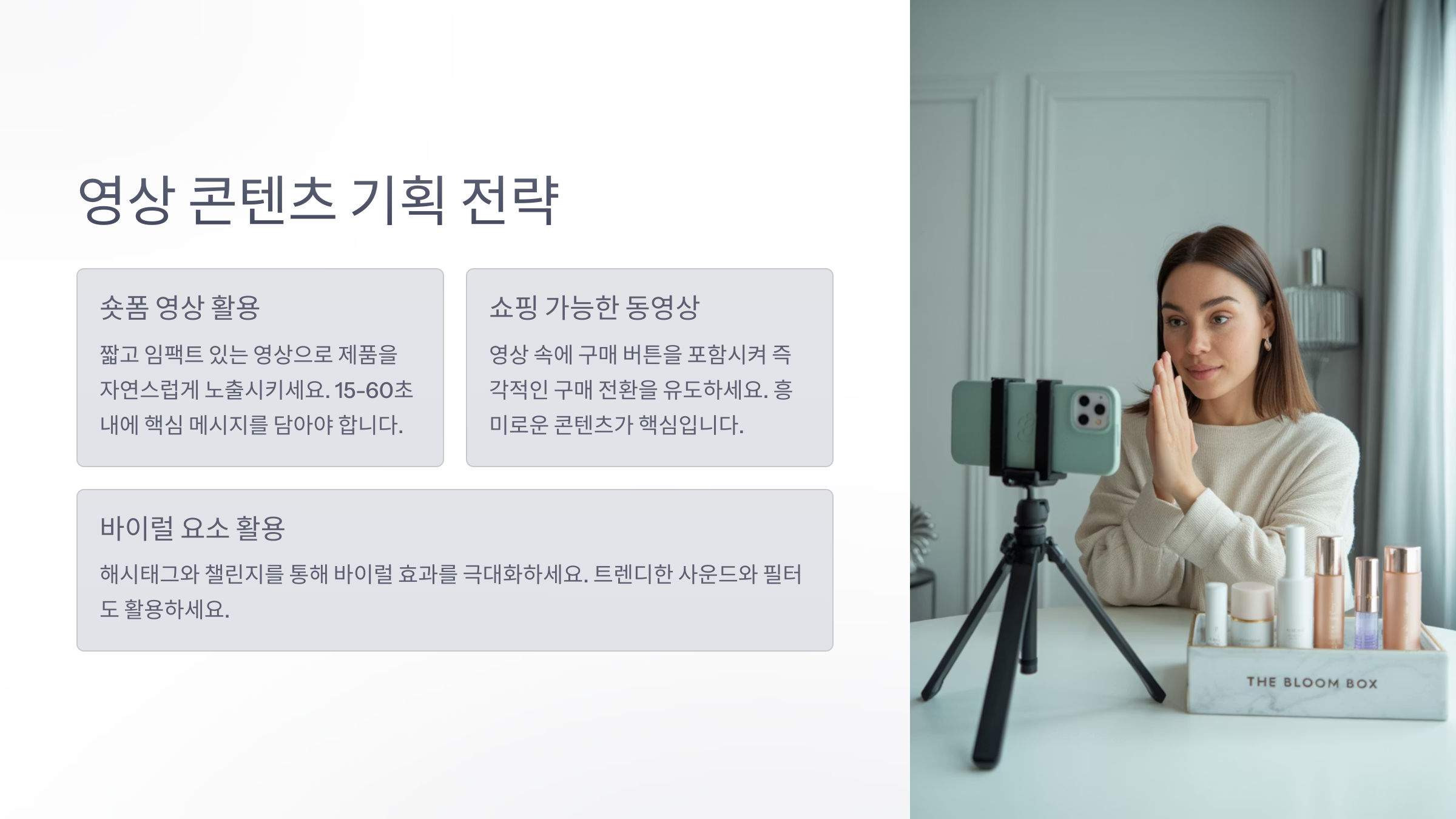 틱톡에서는 ‘영상 기획’이 곧 매출이에요. 제품을 단순히 보여주는 게 아니라, 감정·상황·이야기를 담아야 전환율이 높아져요.🎬 영상 유형별 기획 팁 - 일상형: 사용 장면 브이로그처럼 구성 - 비교형: A vs B, 전후비교 강조 - 후기형: 직접 사용하면서 진심 전달 - 트렌드형: 인기 사운드 + 챌린지 구조 - 꿀팁형: HOW TO, 사용법 요약