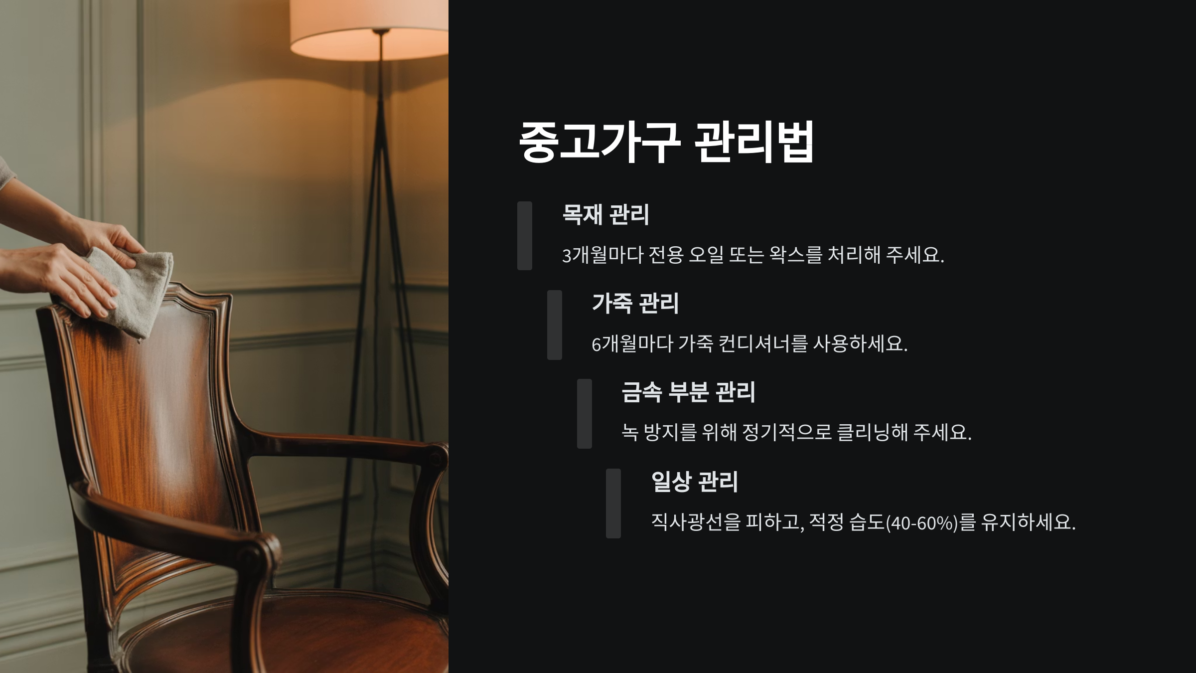 소재 관리법 주의점 나무 오일코팅 수분 과다 주의 패브릭 스팀 청소 먼지와 진드기 가죽 보호제 도포 햇빛 직사 피함 관리만 잘해주면 중고가구도 수년 동안 문제 없이 쓸 수 있어요. 정성을 들이면 그만큼 가구도 오랫동안 나와 함께할 수 있답니다.