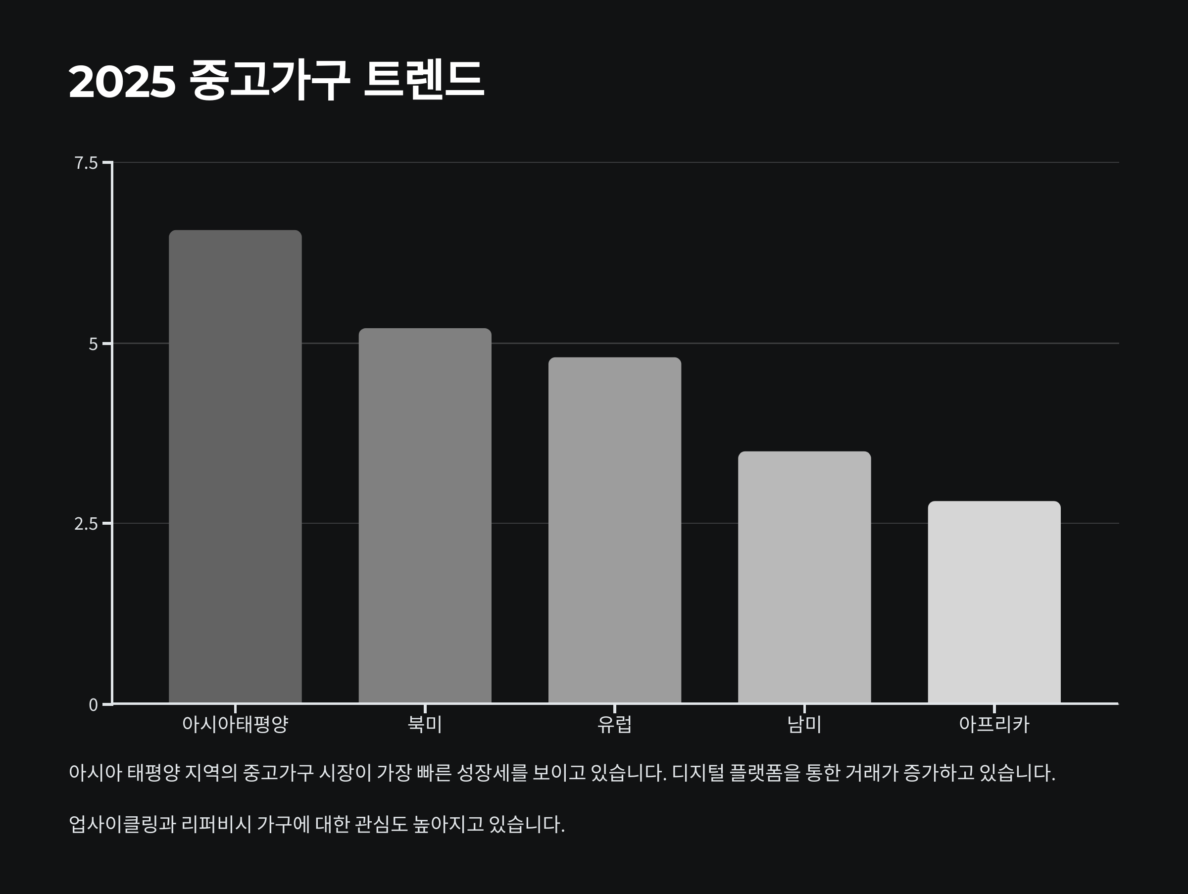 2025년 현재, 중고가구 트렌드는 단순한 '저렴함'을 넘어서 '스타일'과 '가치' 중심으로 이동하고 있어요. 가장 눈에 띄는 건 '빈티지 모던' 스타일이에요. 80~90년대 감성을 담은 서랍장, 북유럽풍 체어 같은 아이템이 인기예요.또한 ‘리폼 중고가구’도 인기예요. 직접 리폼하거나, 작가들이 업사이클링한 가구는 희소성이 있어요. 재료는 낡았지만 새롭게 탄생한 느낌이 있어 감성적인 공간을 꾸미는 데 제격이에요.