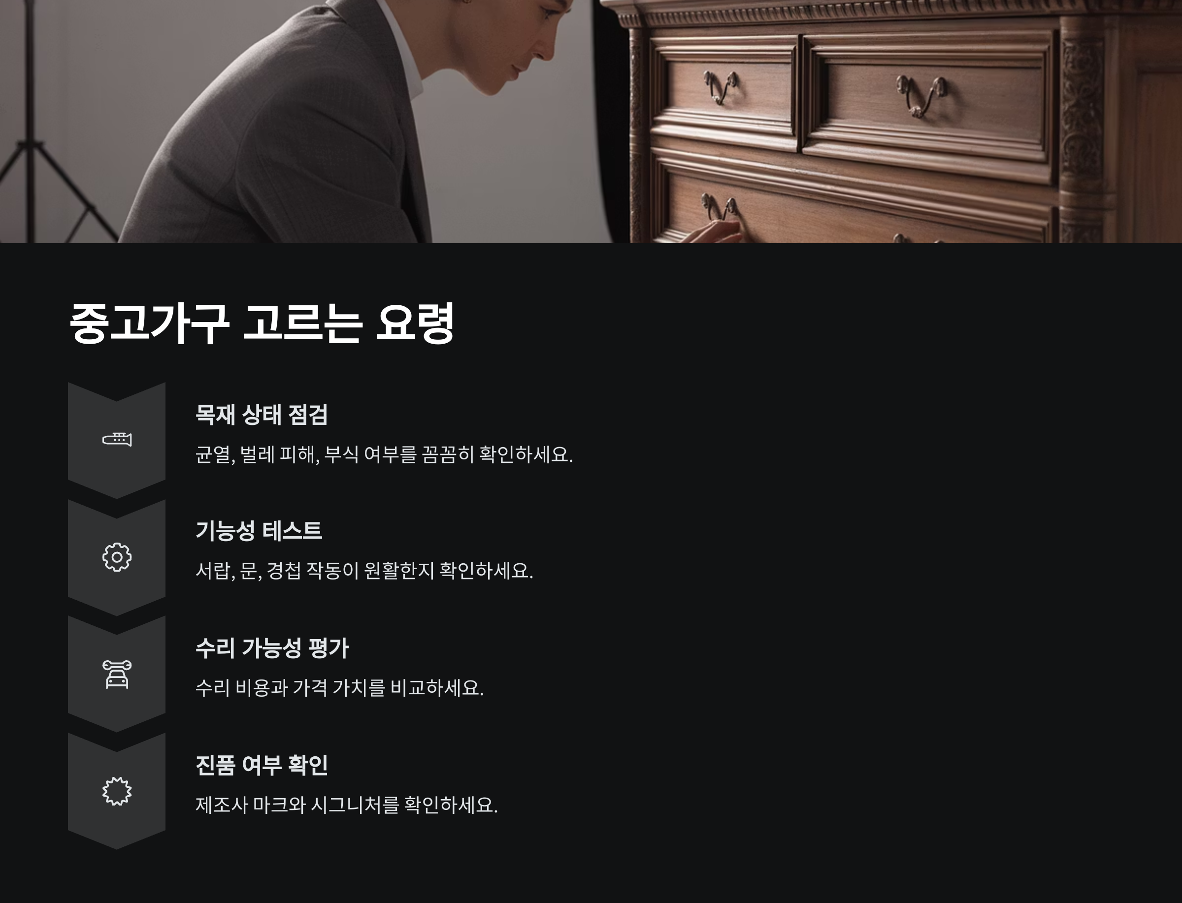 중고가구는 잘 고르면 보물, 못 고르면 골칫덩어리예요. 그래서 고를 때 몇 가지 체크포인트가 필요해요. 가장 중요한 건 내구성이에요. 흔들림이 없는지, 다리나 연결부위가 튼튼한지 꼭 살펴봐야 해요.