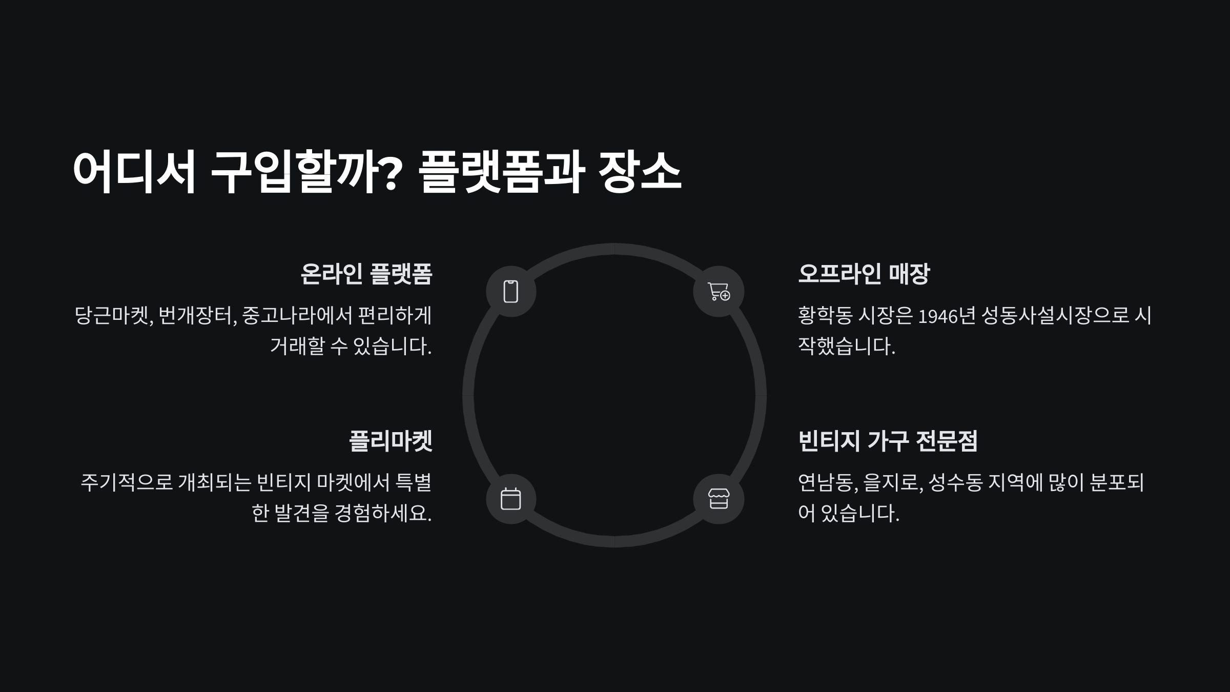 이후 2010년대에는 SNS와 모바일 앱을 통해 개인 간 직거래가 활발해졌어요. 번개장터, 당근마켓 등의 등장으로 동네 기반 거래도 활발히 이루어졌고, 가구 전문 리셀러 업체도 생겨났어요.