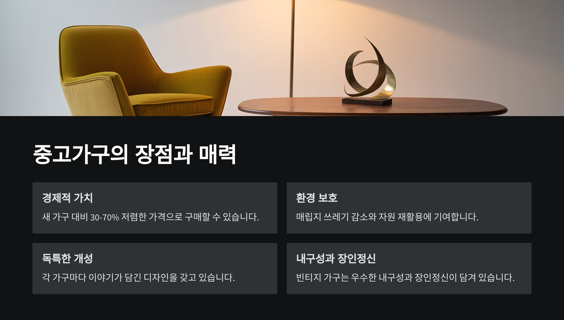 내가 생각했을 때 중고가구 시장은 단순한 재판매가 아니라, 지속가능한 소비를 상징하는 하나의 문화로 자리 잡고 있다고 느껴요. 환경을 생각하고, 자신만의 스타일을 찾는 사람들에게 딱 맞는 선택지죠.
