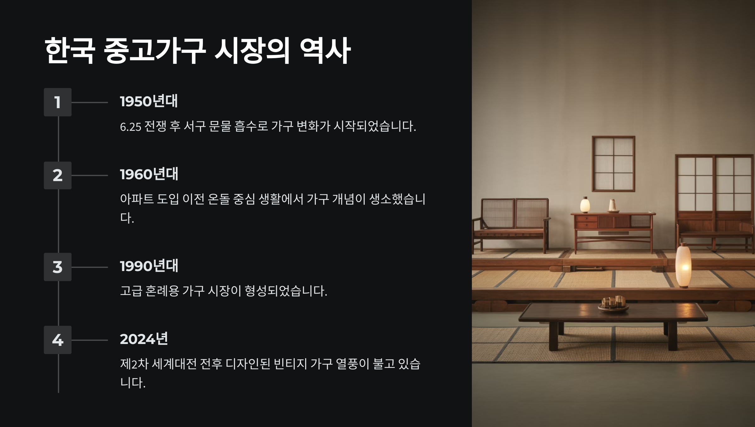 중고가구의 역사는 생각보다 오래됐어요. 과거 조선시대에도 양반가에서는 사용하던 가구를 물려주거나 교환하는 문화가 있었고, 현대에 와서는 일본의 리사이클 문화, 미국의 개러지 세일처럼 한국도 중고 물품에 대한 인식이 조금씩 변화하기 시작했죠.