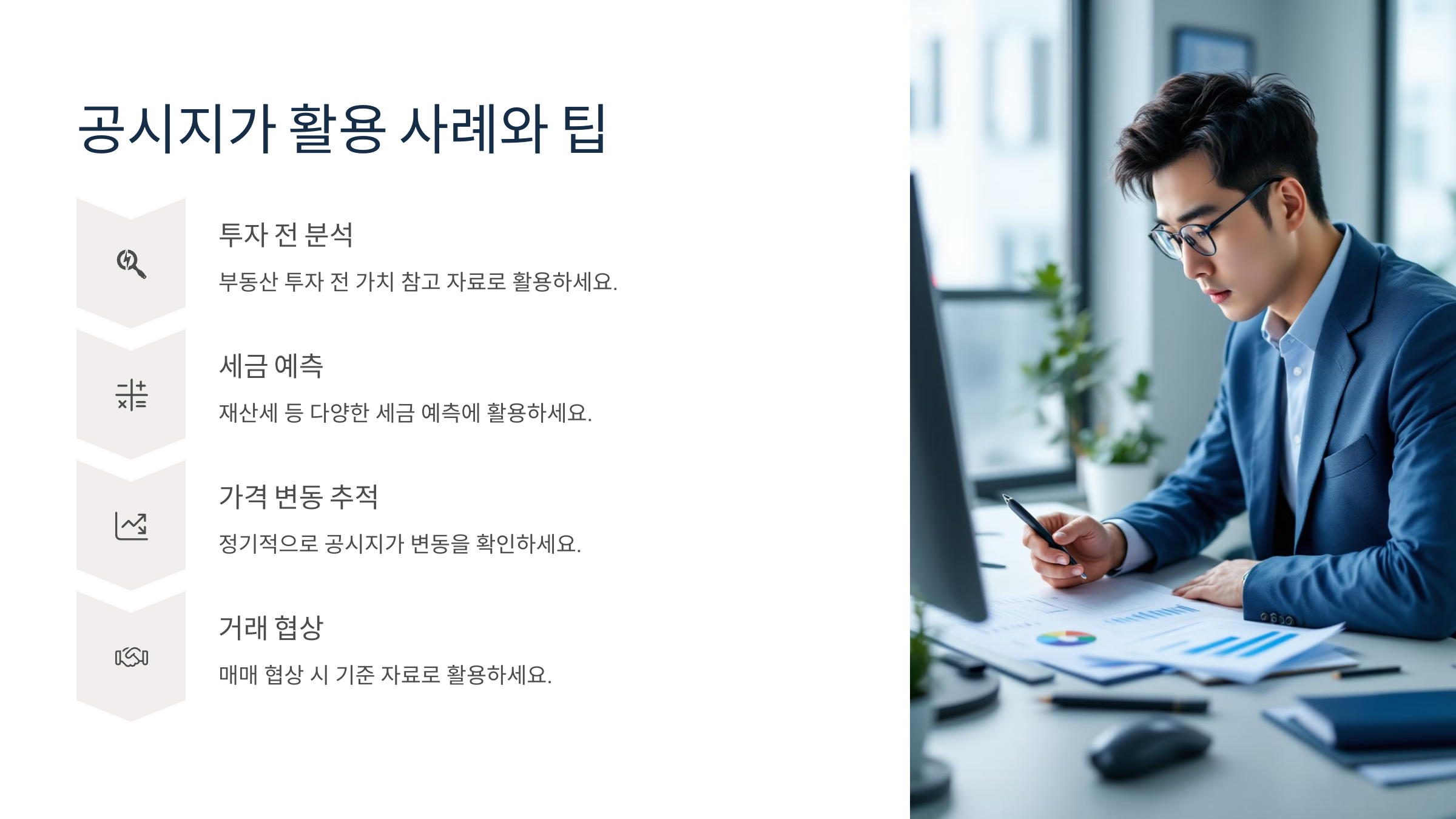 공시지가는 다양한 부동산 관련 업무에서 실제로 활용돼요. 아래 예시를 보면 감이 확 오실 거예요!- 📈 양도소득세 절세 전략 수립: 공시지가 기준으로 보유기간별 세금 시뮬레이션 가능