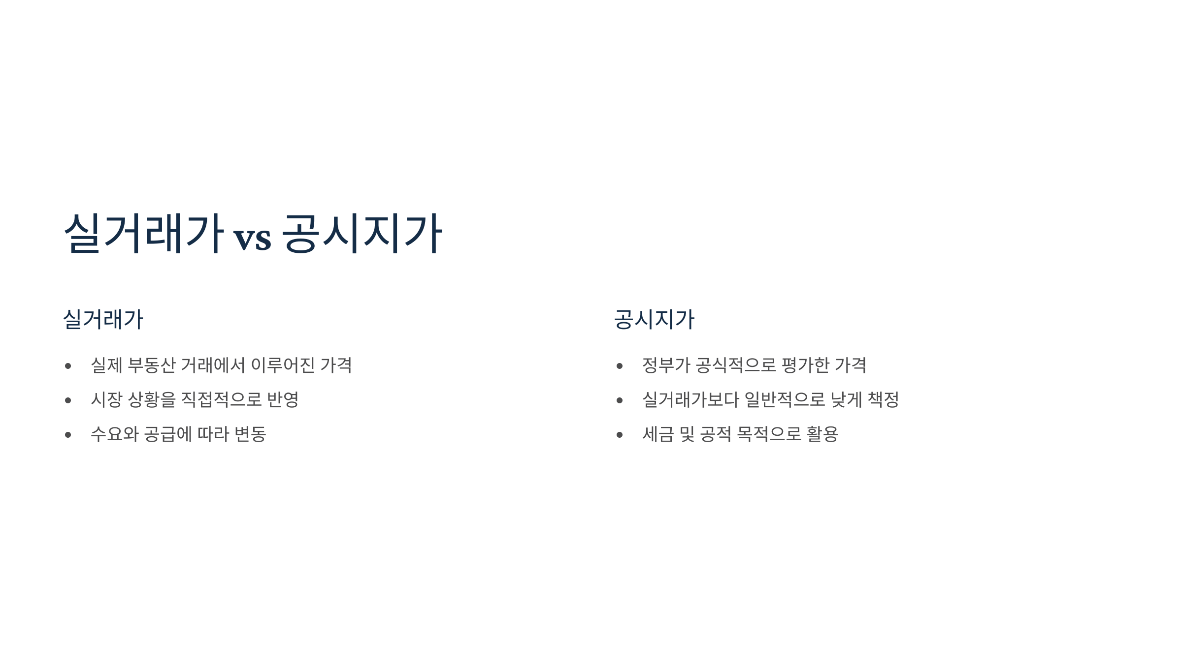 구분 공시지가 실거래가 의미 정부가 고시한 기준 가격 실제 거래 시점의 계약 금액 주체 국토부, 지자체 매수자 ↔ 매도자 용도 세금 기준, 공공용도 시장 가치 판단 기준 변동 주기 1년에 한 번 고시 수시로 변동 🌐 조회 가능한 공식 사이트 소개