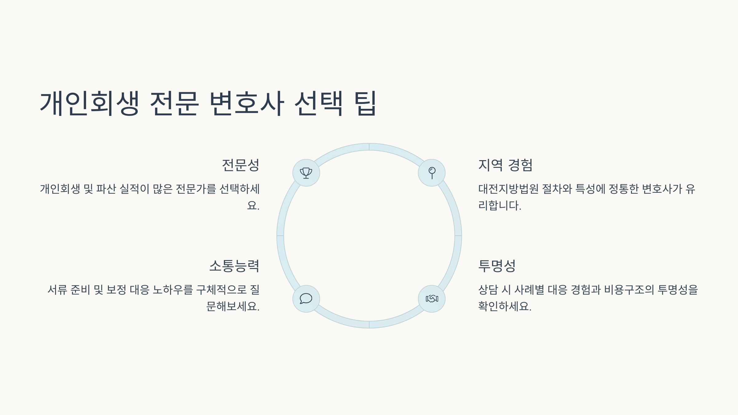또 하나 팁! 대전에서 개인회생을 많이 진행한 경험이 있는 변호사일수록, 대전지법 심리 경향이나 회생위원 스타일을 잘 알아서, 유리하게 절차를 이끌어줄 가능성이 높아요.