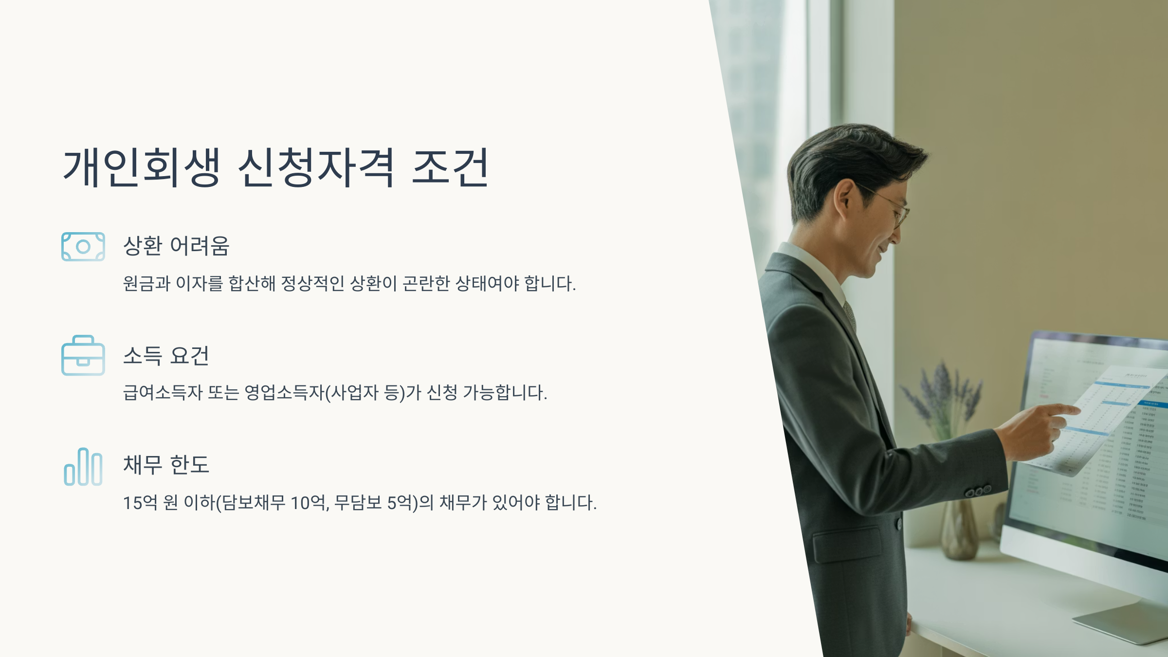 개인회생은 누구나 신청할 수 있는 제도는 아니에요. 법적으로 정해진 자격 요건이 있어서, 이 조건을 충족해야만 신청이 가능해요. 가장 기본적인 조건은 소득이 꾸준히 있어야 한다는 점이에요.