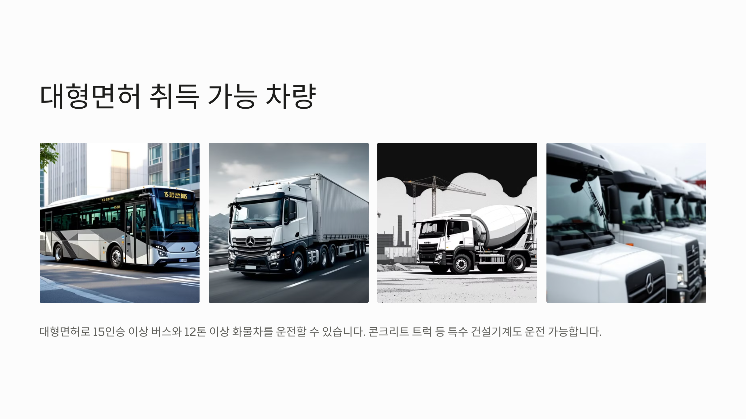 대형면허는 안전과 책임이 중요한 자격이에요. 사람을 태우거나 대형 장비를 운전하기 때문에 면허 시험도 까다롭고, 실기 시험의 난이도도 높은 편이에요. 그렇지만 취득하면 운전직, 운수업 취업에서 큰 경쟁력이 돼요 💼