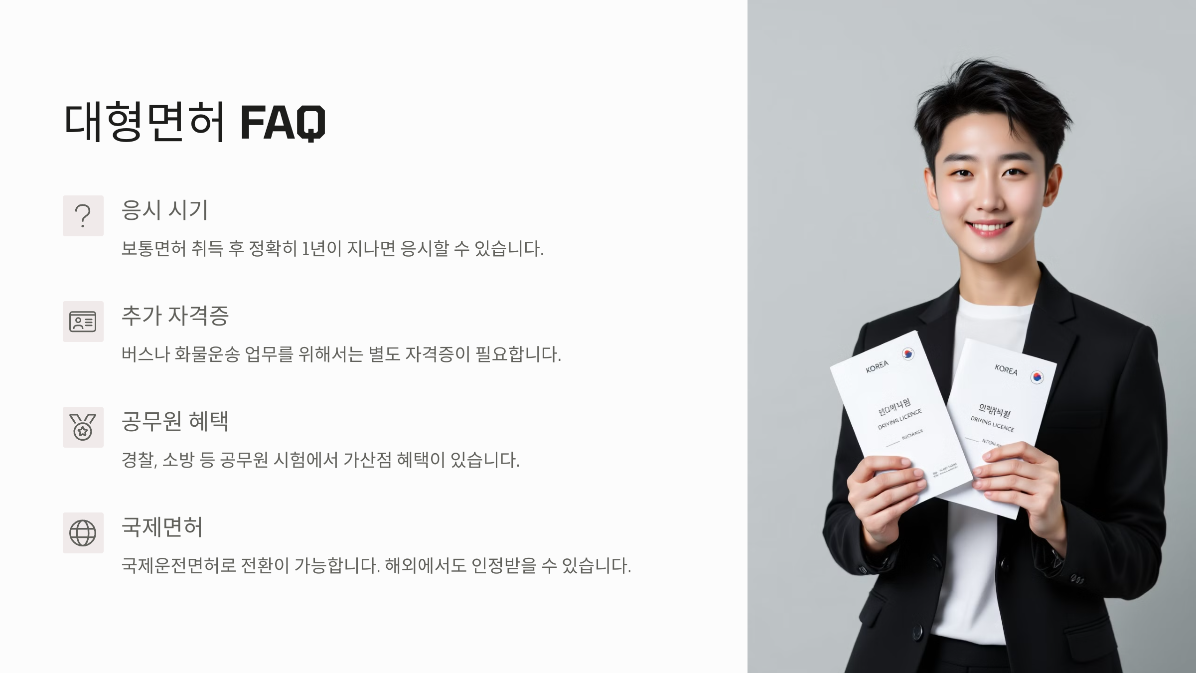 이런 지원 제도를 잘 활용하면 대형면허 취득 비용을 반값 이하로 줄일 수 있어요! 👉 다음은 FAQ 대형면허 관련 가장 궁금한 질문 8가지, 알짜 정보로 정리해드릴게요.