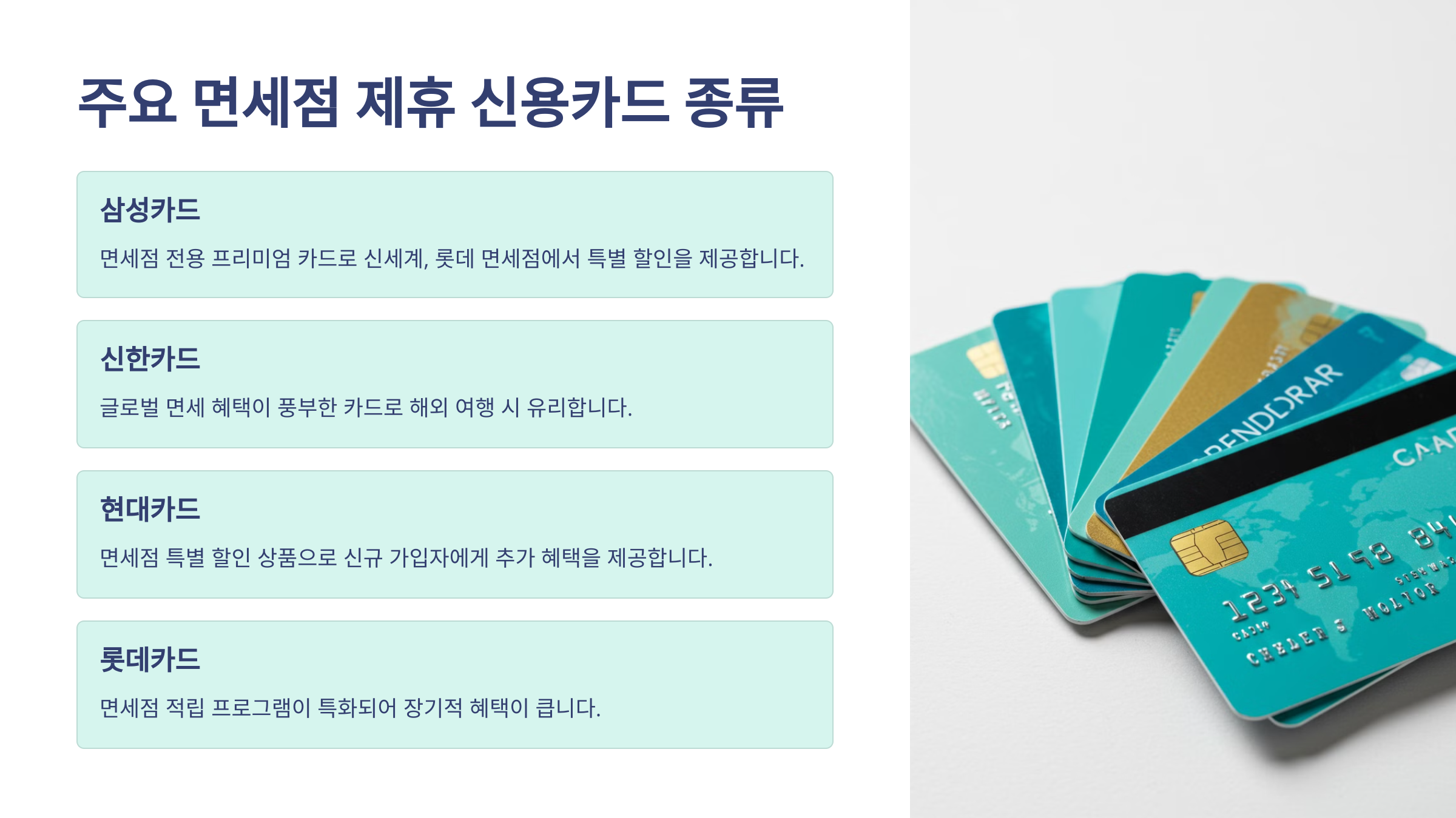 다음 문단에서는 실제 어떤 카드들이 면세점에서 할인 혜택이 좋은지, 카드 종류별로 알아볼게요. 어떤 카드가 나에게 맞을지 잘 비교해보는 게 중요하답니다! 😊