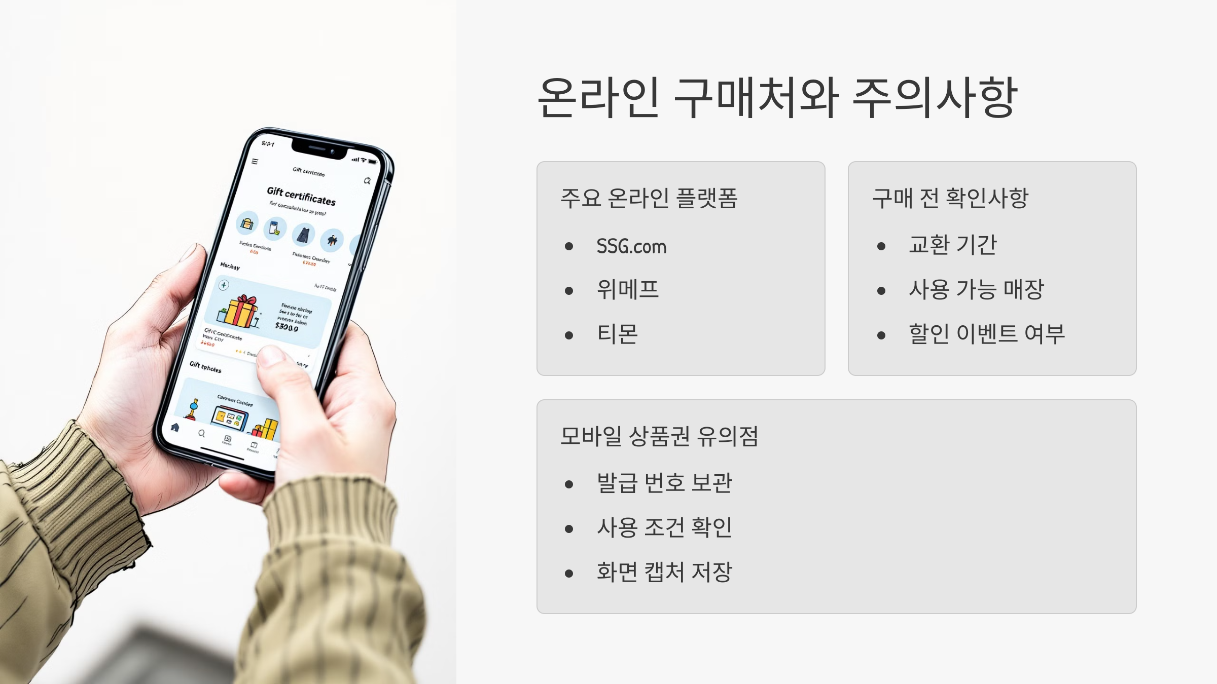 또 하나! 유효기간을 꼭 확인해야 해요. 일부 온라인 상품권은 유효기간이 6개월인 경우도 있으니, 구매 전 ‘사용기한’을 꼼꼼히 체크하세요. 유효기간이 지난 모바일 상품권은 연장 또는 환불이 어려운 경우도 있어요.
