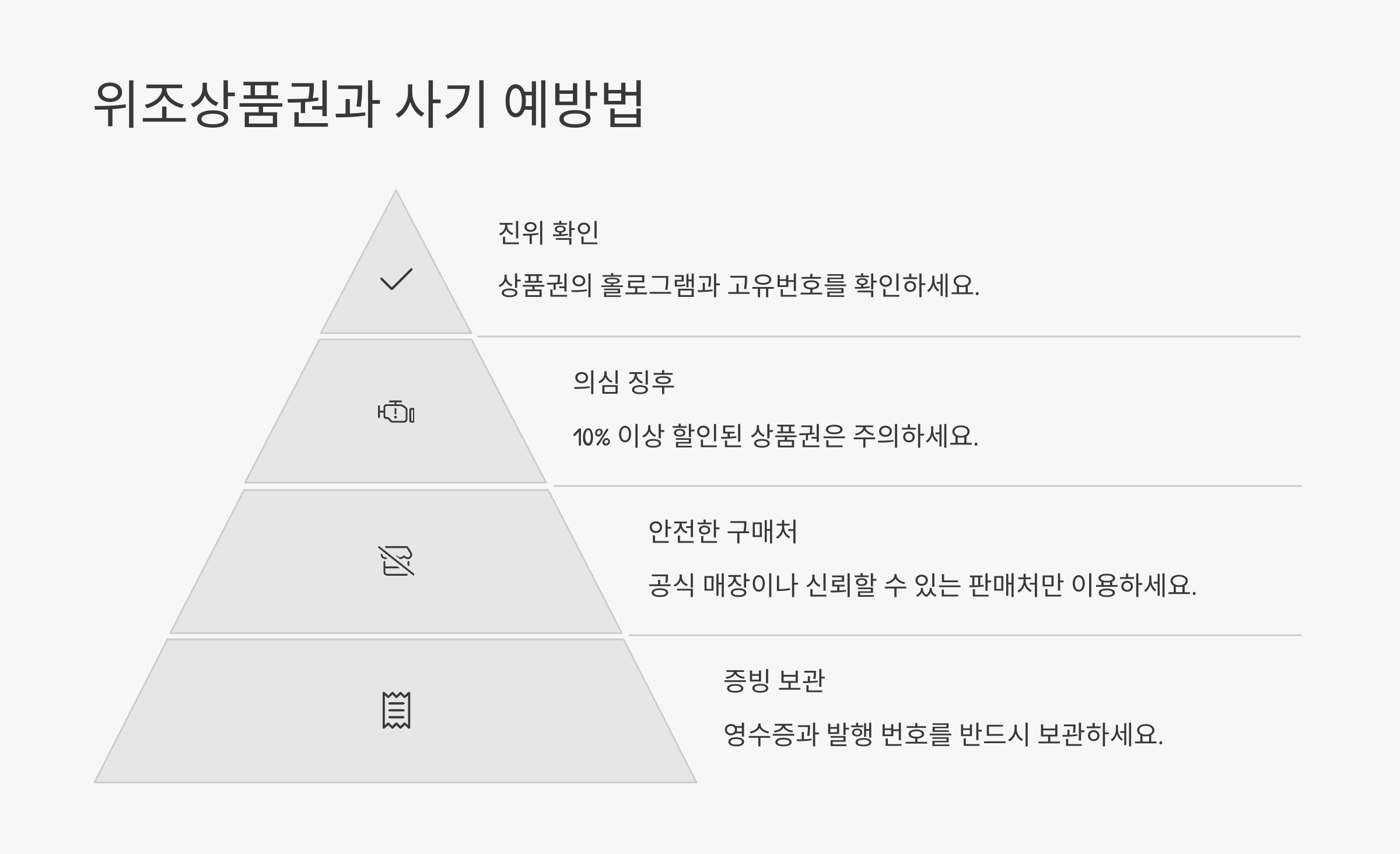 사기를 방지하려면 반드시 공식 플랫폼 또는 인증된 판매자에게서만 구매해야 해요. 예: 번개장터 안심결제, 카카오 선물하기, 네이버 인증 판매자 등. 그리고 상품권 일련번호가 있는 상태에서만 거래하세요.