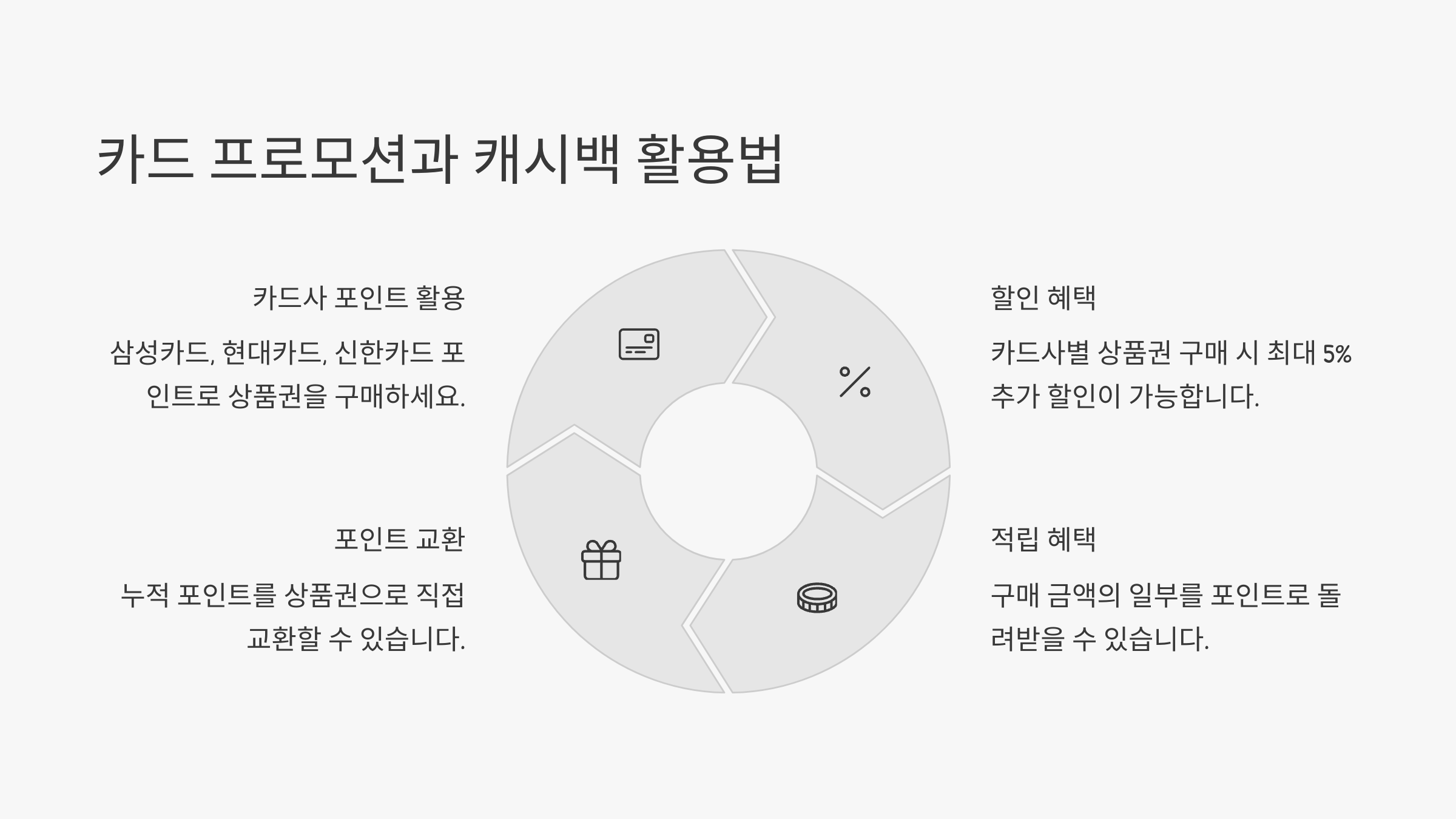 특히 국내 카드사의 특별 제휴 행사는 주말이나 명절 직전에 집중되니, 해당 시기엔 꼭 카드사 홈페이지나 앱에서 이벤트를 확인해보세요. '상품권 구매도 혜택이 되나요?' 하고 놓치는 분들 많지만, 실제로는 대부분 카드사에서 집중적으로 운영한답니다!