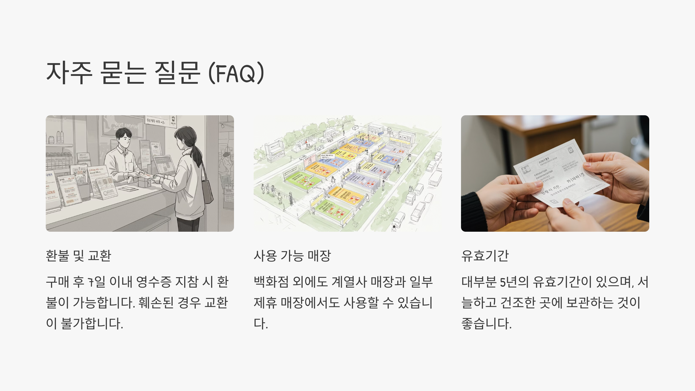 백화점 위조 방지 요소 확인 방법 신세계 워터마크, 요철 마킹 빛에 비춰 ‘신세계’ 확인 롯데 미세 프린팅 라인 확대 시 선명한 테두리 현대 홀로그램 띠, 형광 패턴 띠 연결 확인, 빛에 반사 아무리 싸더라도 ‘의심스러운 거래는 피하기’ 이게 상품권 구매의 철칙이에요! 👉 이제 마지막! FAQ 많이 궁금해하시는 질문 8가지를 친절하게 정리해드릴게요