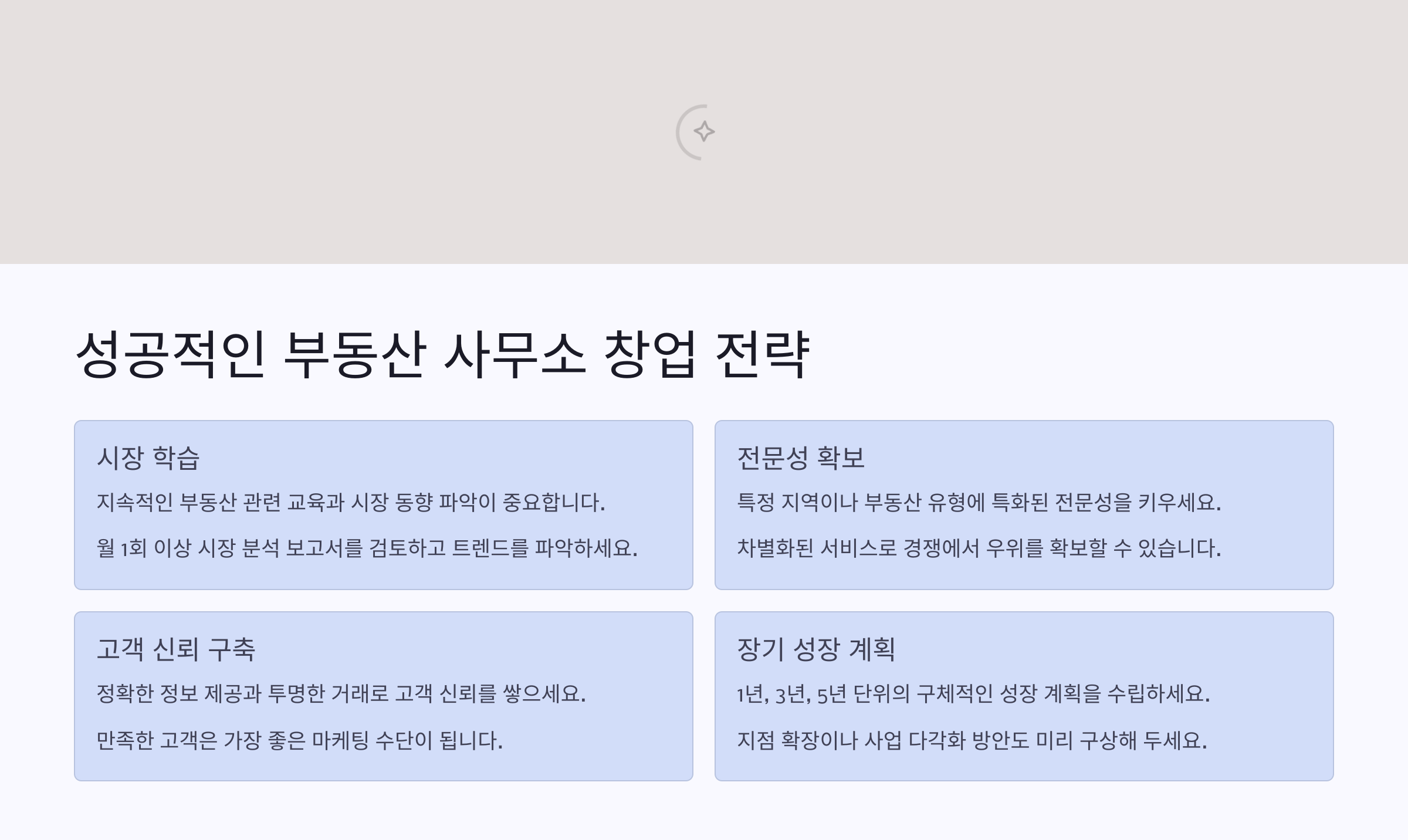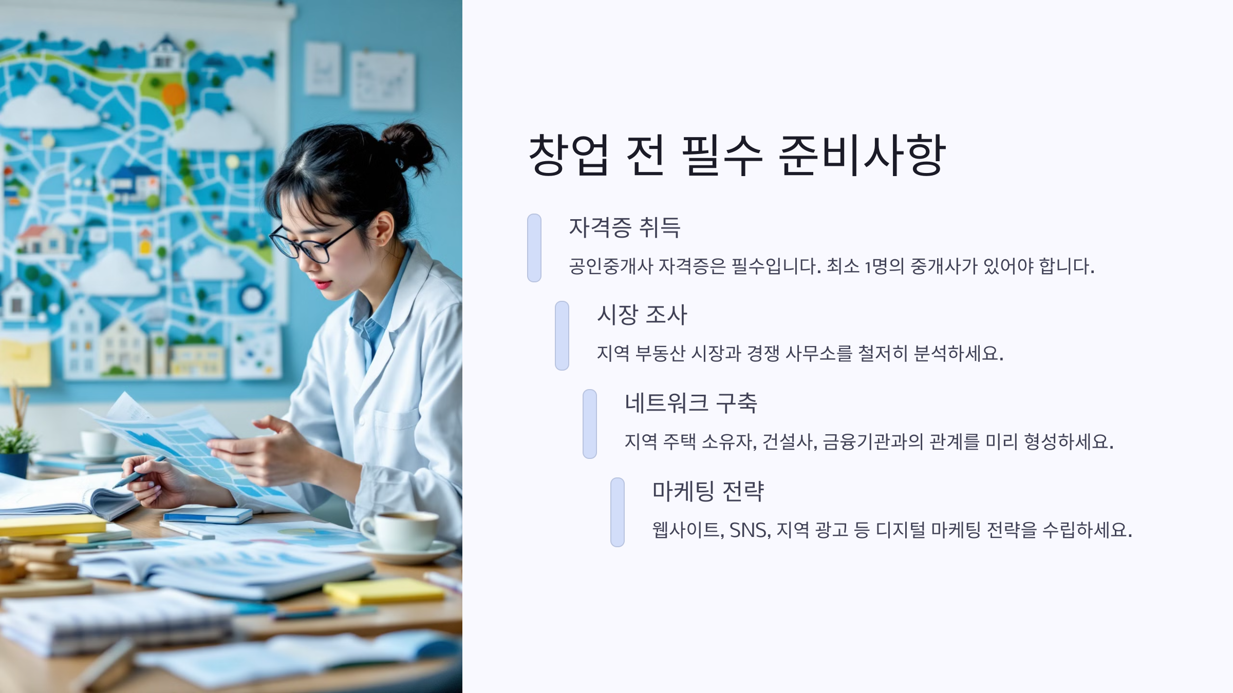 부동산 창업은 물리적인 공간보다 ‘운영’과 ‘신뢰’가 핵심이에요. 준비 시 다음 팁을 참고해보세요!