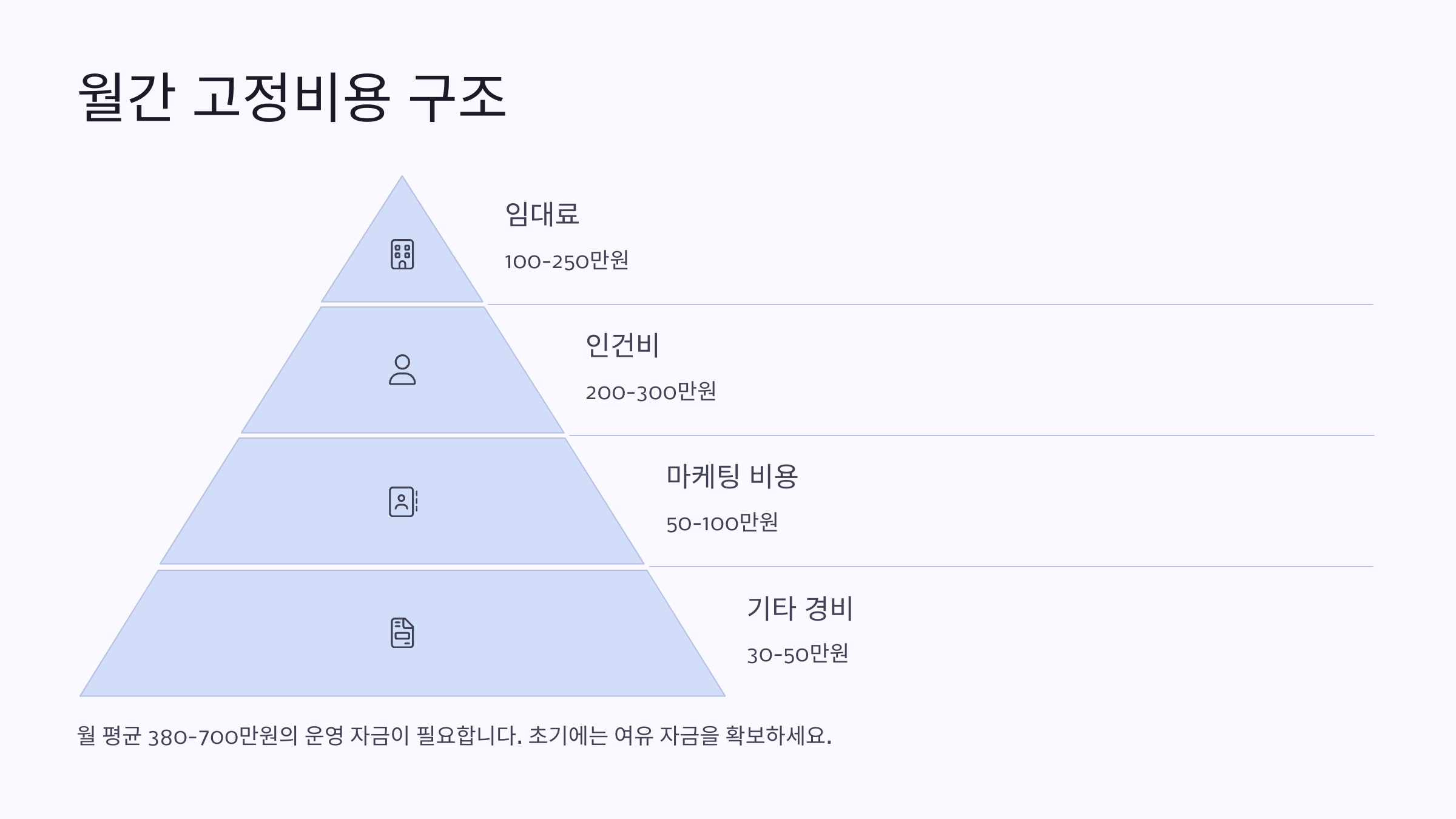 창업 후에는 매달 고정으로 나가는 비용이 있어요. 이것도 꼭 예산에 포함해야 해요:- 💳 사무실 월세: 평균 30~70만 원
