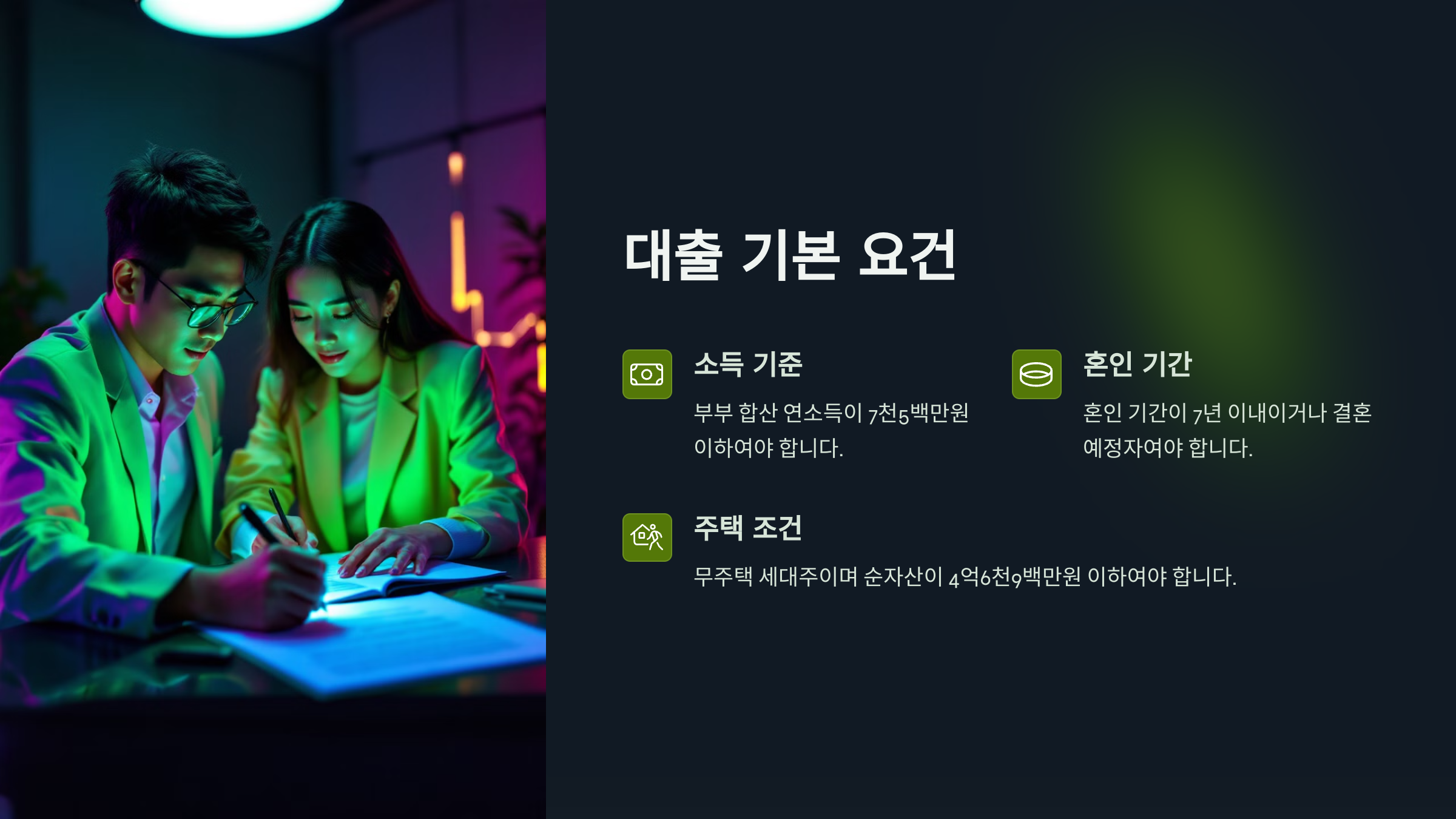 • 💼 부부합산 연소득 7천만 원 이하 (맞벌이 시 8천5백만 원 이하)