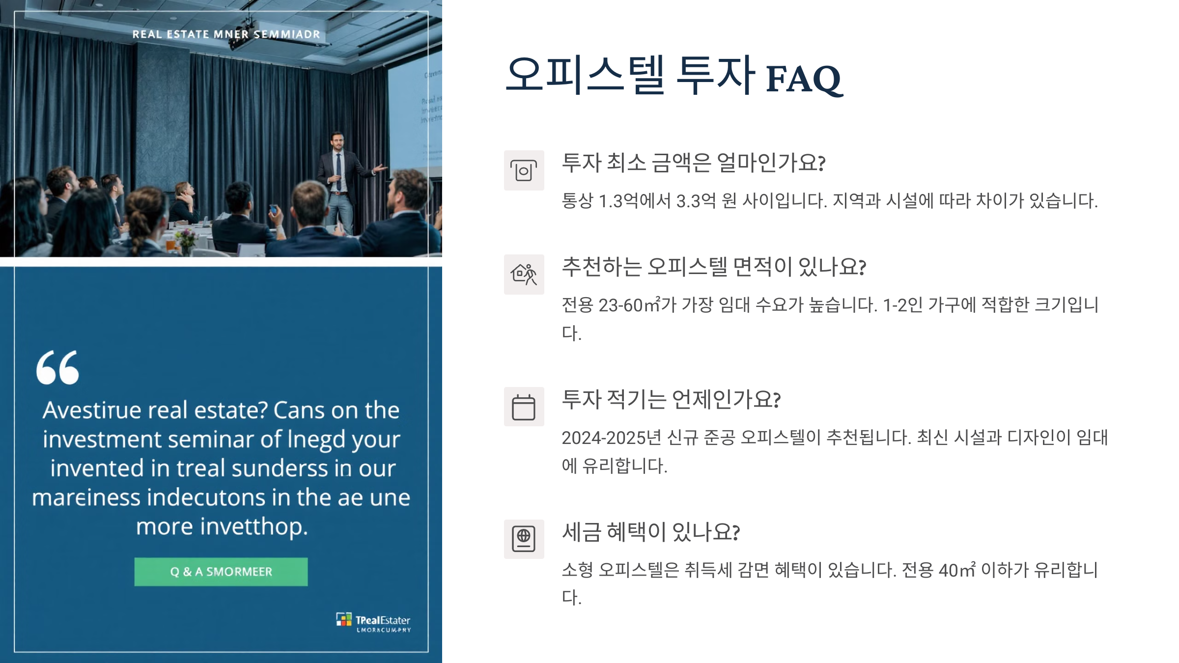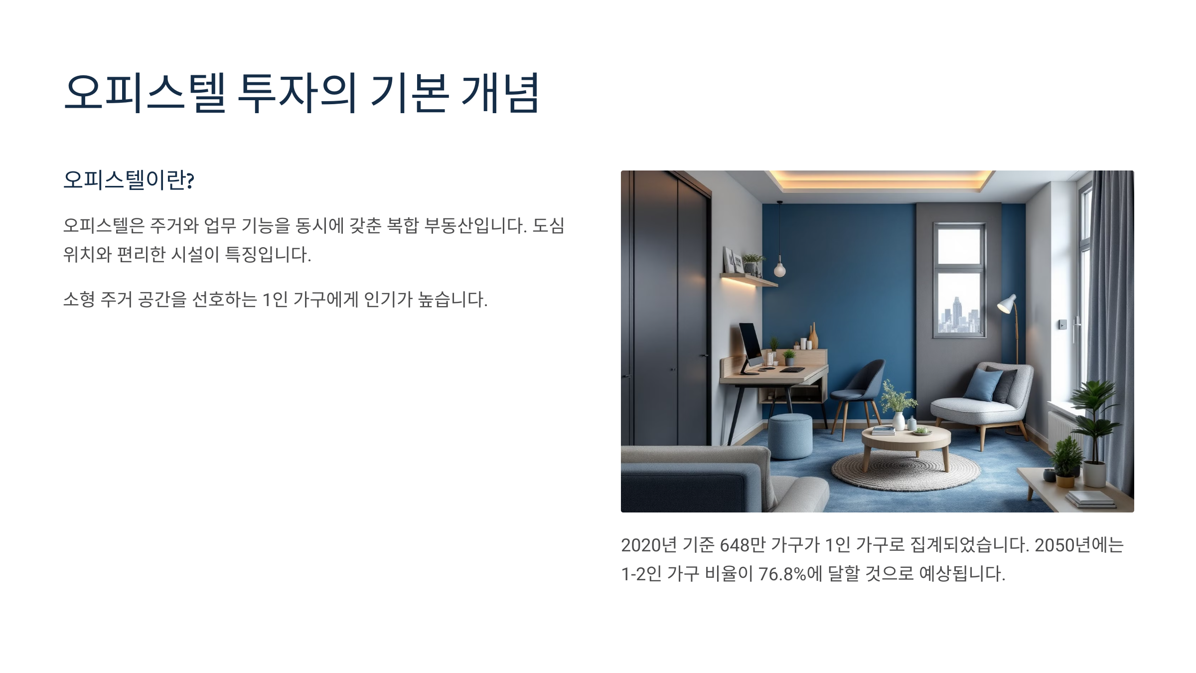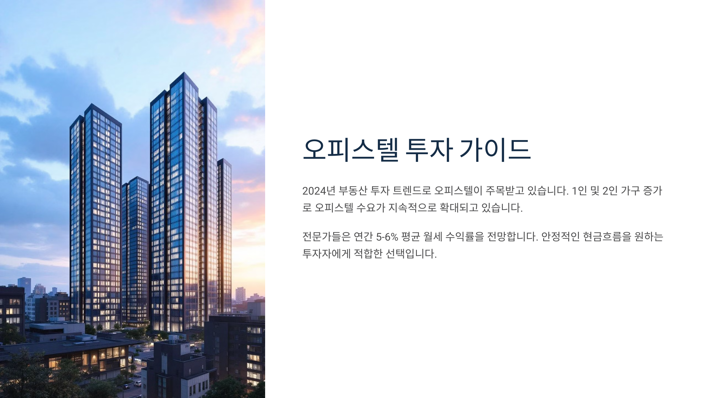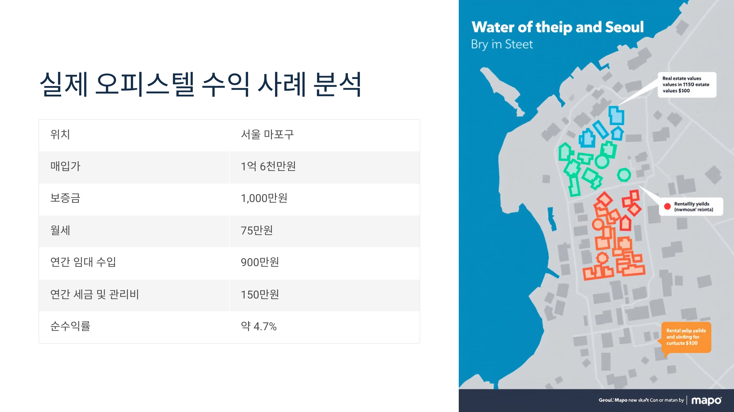 내가 생각했을 때 오피스텔 투자는 수익률 계산이 전부예요. 단순한 매매가 대비 임대료 수익뿐 아니라 공실률, 세금, 대출이자까지 포함해서 순수익을 따져야 제대로 된 판단이 가능하죠.