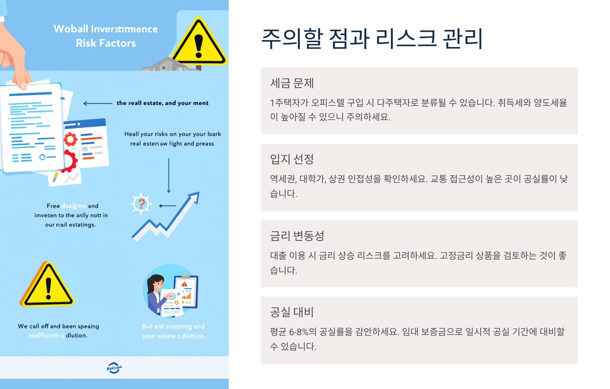 오피스텔 투자는 비교적 진입장벽이 낮지만, 그만큼 리스크도 있어요. 아래 내용을 꼭 숙지해야 해요:- 📉 공실 리스크: 위치에 따라 최대 6개월 이상 공실 발생 가능
