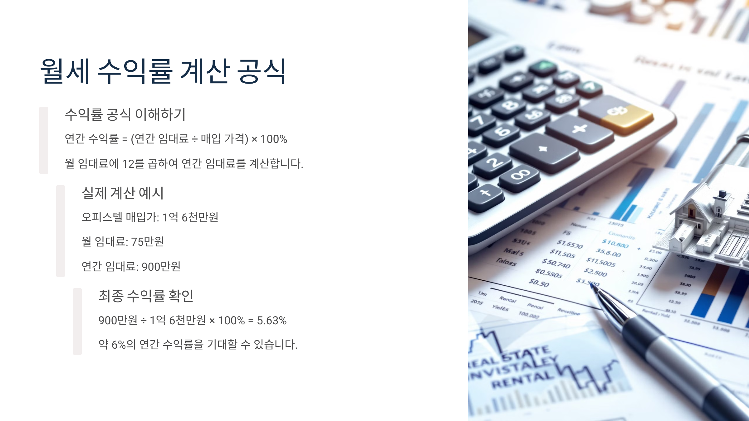 오피스텔의 수익률은 기본적으로 아래와 같은 공식으로 계산할 수 있어요: