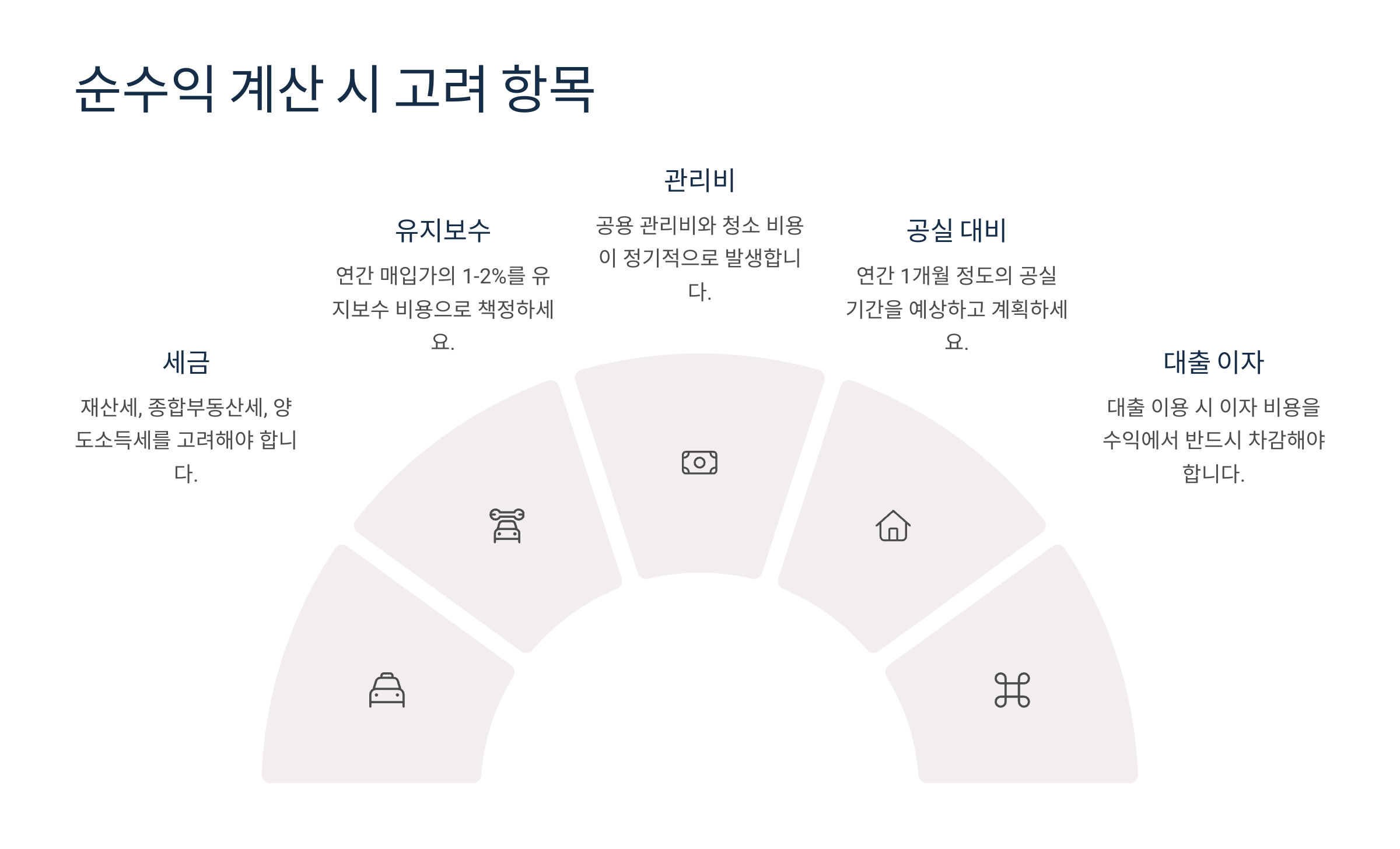 실제 수익을 구하려면 고정비와 변동비 모두 포함한 ‘순수익’을 계산해야 해요. 아래 항목들을 꼭 체크하세요:- 📌 취득세 – 매입 시 발생, 보통 4.6%