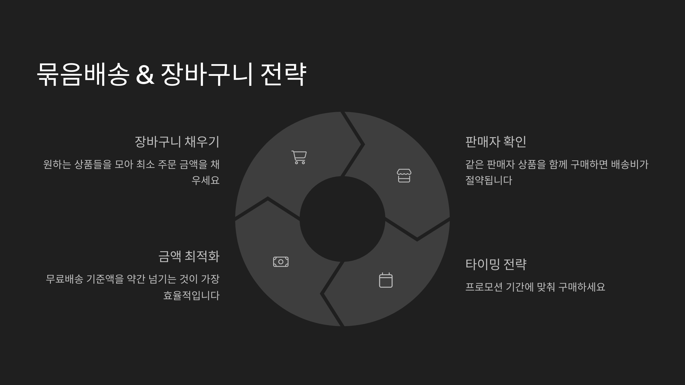 전략 설명 활용 팁 같은 판매자 상품 묶기 동일 셀러 상품을 한 번에 결제 장바구니에서 셀러명 체크 장바구니 대기 전략 프로모션 타이밍에 맞춰 결제 매월 1일, 주말 집중 체크 정기배송 묶음 생활용품 반복 주문 시 유용 자동결제 설정 시 추가 할인 합배송 표시 확인 ‘합배송 가능’ 상품만 선택 상품페이지 아이콘 확인 묶음배송과 장바구니 전략만 잘 써도 한 달에 수천 원~만원 이상 절약할 수 있어요!