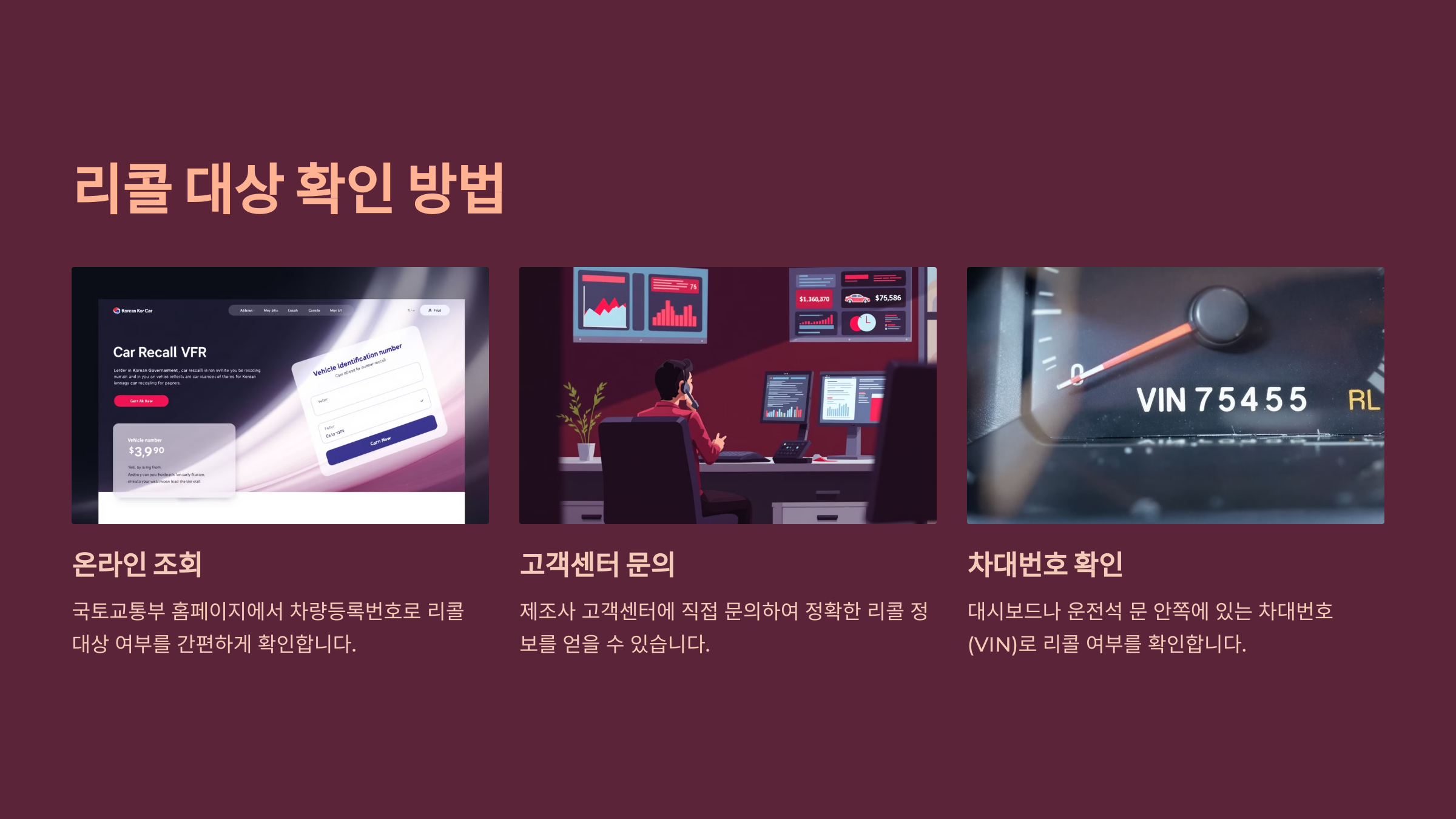 그 외에도 현대자동차, 기아, 쉐보레, 르노, BMW, 벤츠, 도요타 등 대부분의 브랜드는 자사 홈페이지에서 리콜 조회 시스템을 제공하고 있어요. 차량번호만 입력하면 간단하게 내 차의 상태를 확인할 수 있어요.