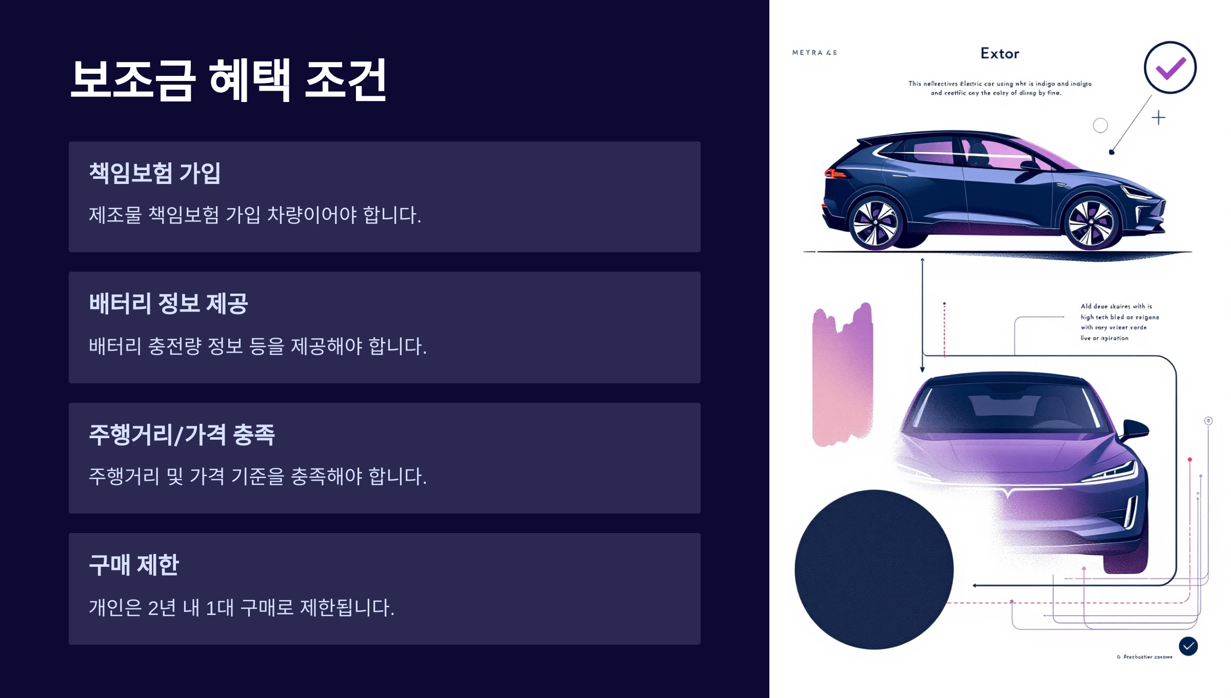 전기차 보조금을 받기 위해서는 몇 가지 조건을 충족해야 해요. 첫 번째로, 구매자가 일반 소비자여야 하며, 법인이나 단체는 지원 대상에 포함되지 않아요. 두 번째로, 전기차가 배출가스 0g/km 차량이어야 하고, 충전 인프라가 갖춰진 지역에서 구매해야 해요. 또, 전기차 구매 시 반드시 본인의 이름으로 등록을 해야 하며, 중고차는 보조금 지급 대상에서 제외돼요.
