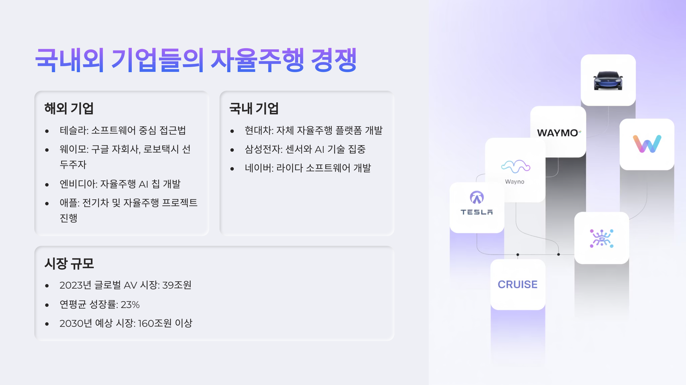 자율주행 기술은 자동차 제조사뿐 아니라 IT기업까지 뛰어든 경쟁이에요. 대표적으로 구글의 웨이모, 테슬라, GM 크루즈, 바이두 아폴로 등이 있어요.
