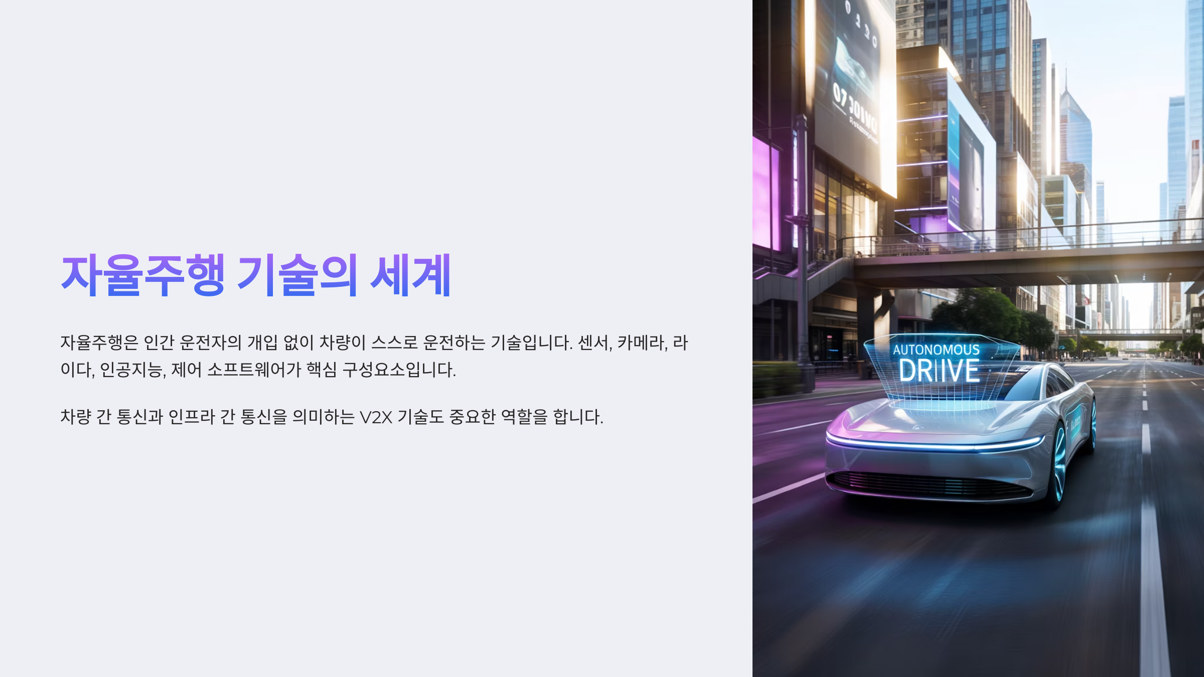 자율주행은 차량이 운전자의 개입 없이 스스로 주행 판단을 하고, 가속, 감속, 조향, 정차를 수행하는 기술이에요. AI와 센서 기술이 핵심이죠.