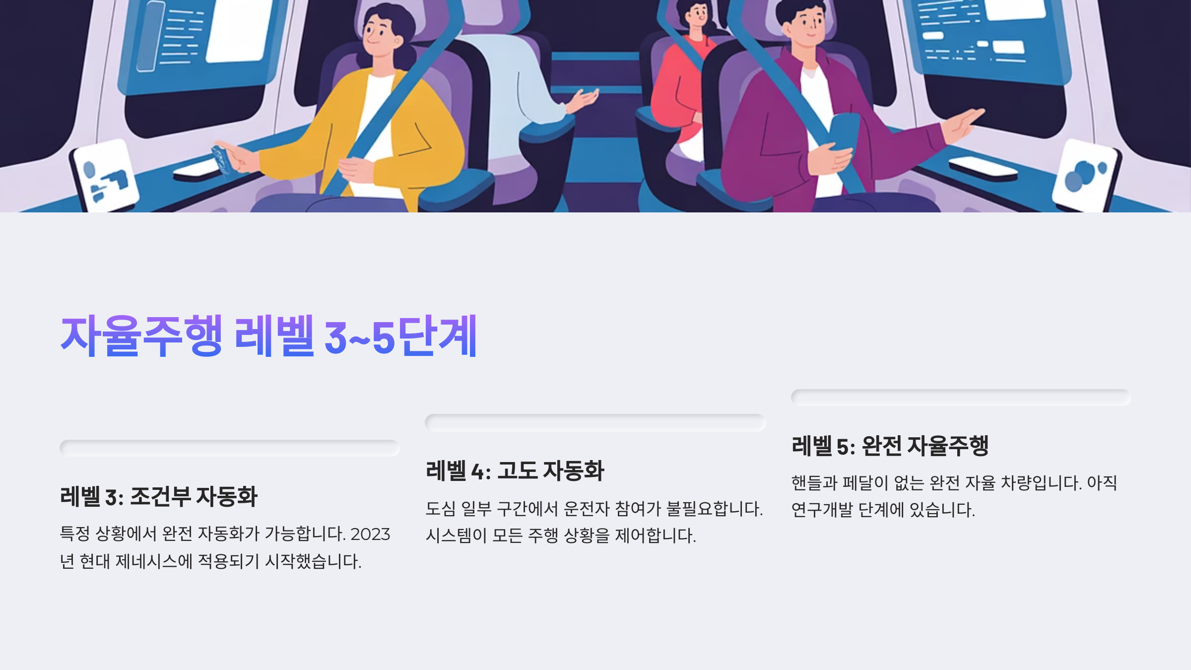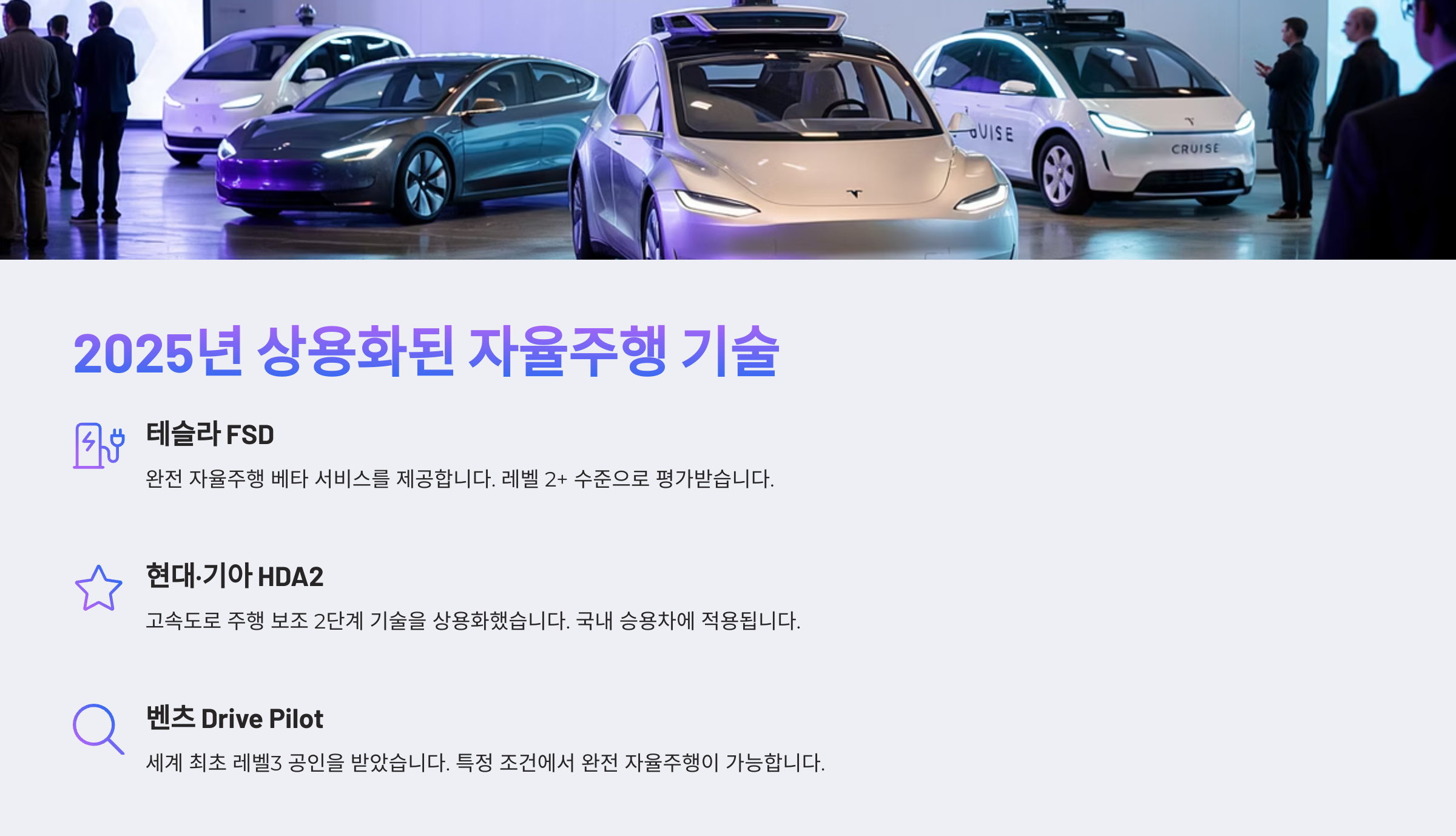 2025년 현재는 레벨 2.5~3 수준이 일반 차량에 적용되고 있고, 레벨 4는 제한적 구역(예: 미국 피닉스 시범 구역 등)에서 운영 중이에요.