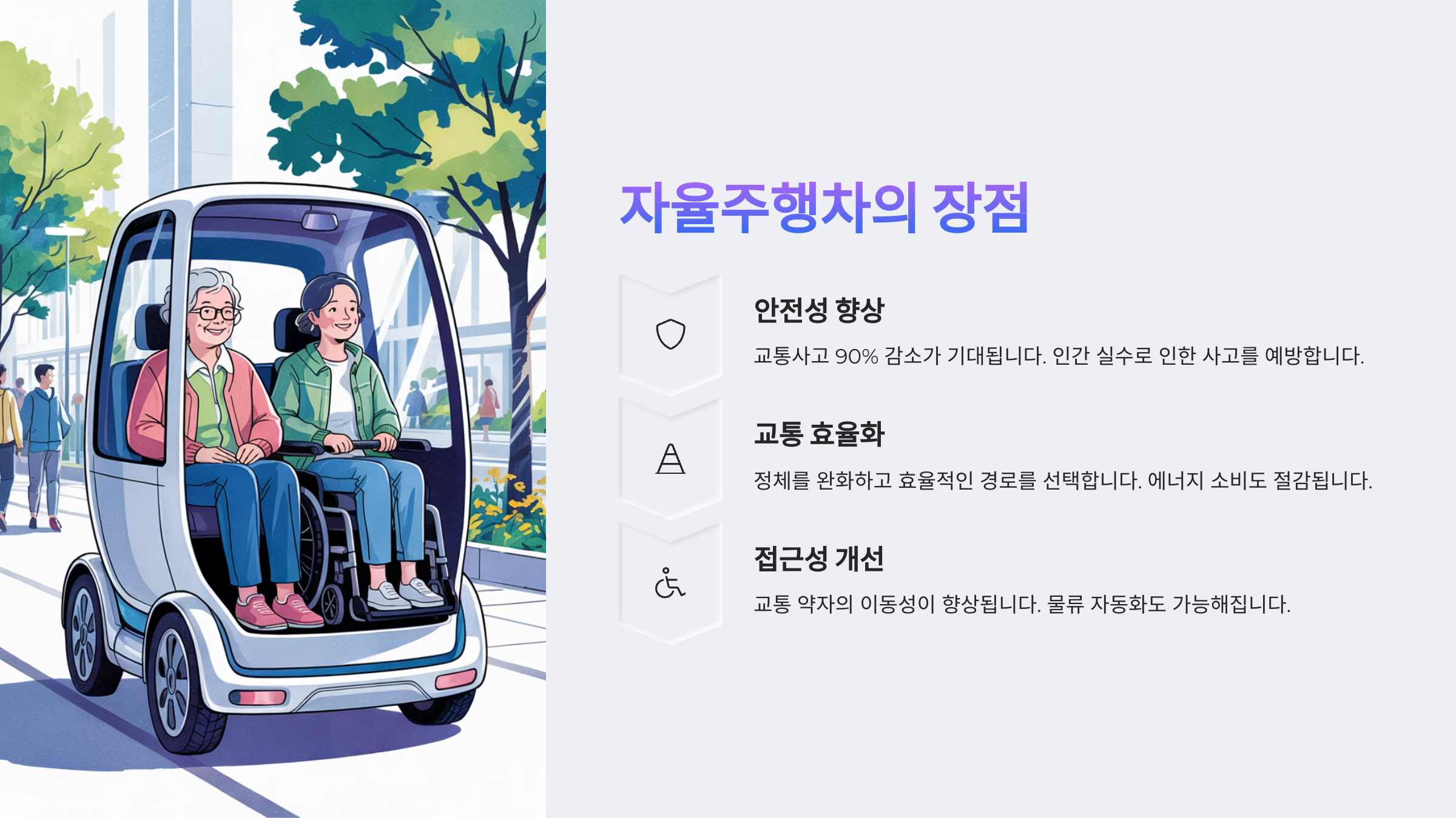 장점은 운전 피로 감소, 교통사고 예방, 노약자 이동 편의성, 에너지 절감 효과 등이 있어요.